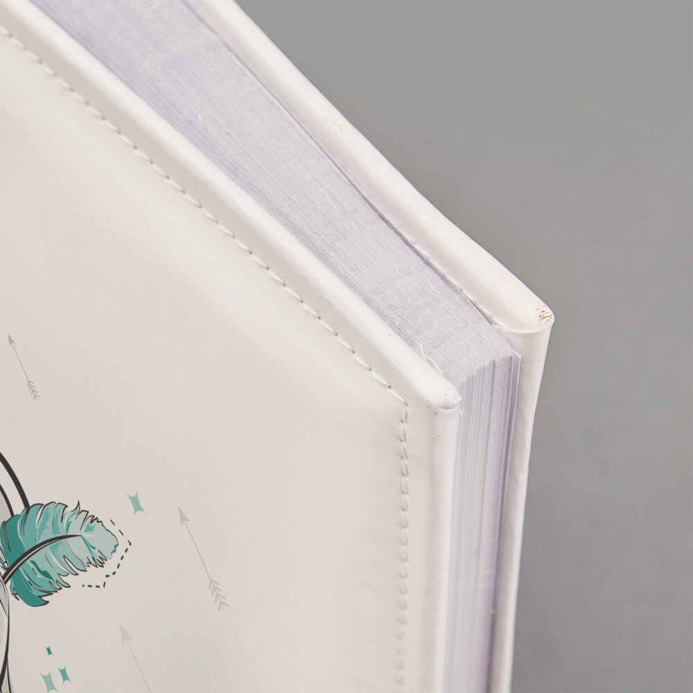 Tradycyjny album na zdjęcia w nowoczesnym wydaniu. Skórzana okładka jest lekko błyszcząca. Skórka jest ekologiczna, gładka w dotyku, w kolorze białym. Album jest prosty i klasyczny, pasujący do wielu okazji. W środku znajdują się kremowe karty. Album jest zszywany, dzięki czemu mamy gwarancję trwałości. Idealny dla osób szukających albumu na dużą ilość zdjęć.