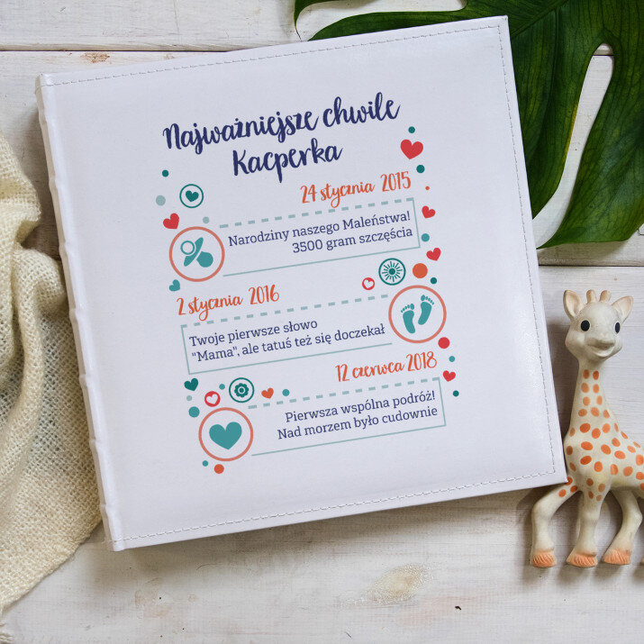 Ta zniewalająca pamiątka to nie tylko kolorowe fotografie powklejane na eleganckie strony - to skarbnica wyjątkowych uczuć. Dzięki niej emocje towarzyszące pierwszemu słowu czy pierwszej wspólnej podróży pozostaną przy Was na zawsze, zaczarowane w niezwykłym albumie. Spersonalizowany grawer dodaje przedmiotowi osobistości i niebanalnej elegancji.