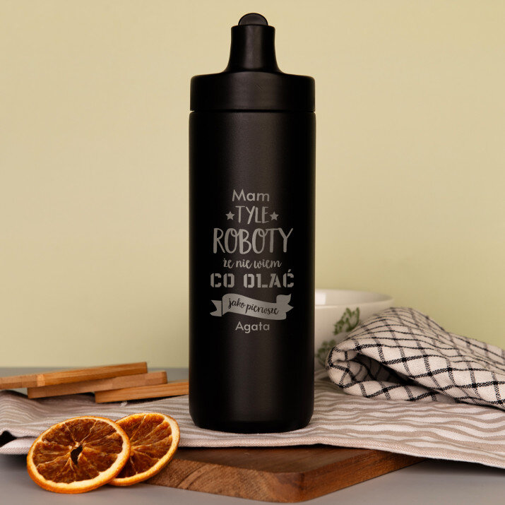 Wyjątkowy bidon w kolorze czarnym lub beżowym to nieoceniony towarzysz Twoich codziennych wypraw! Utrzymuje temperaturę napoju przez 8 godzin i nie przecieka, więc wygoda podczas użytkowania jest zapewniona! Bidon ma pojemność 500 ml. Niezwykle estetyczny design wyróżnia go i dodaje elegancji. Dodatkowo personalizowany grawer z pewnością zachwyci obdarowaną osobę! Jest to idealny prezent dla każdego, kto ceni praktyczne upominki.