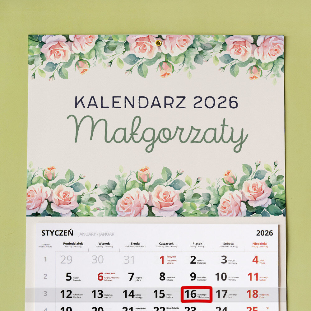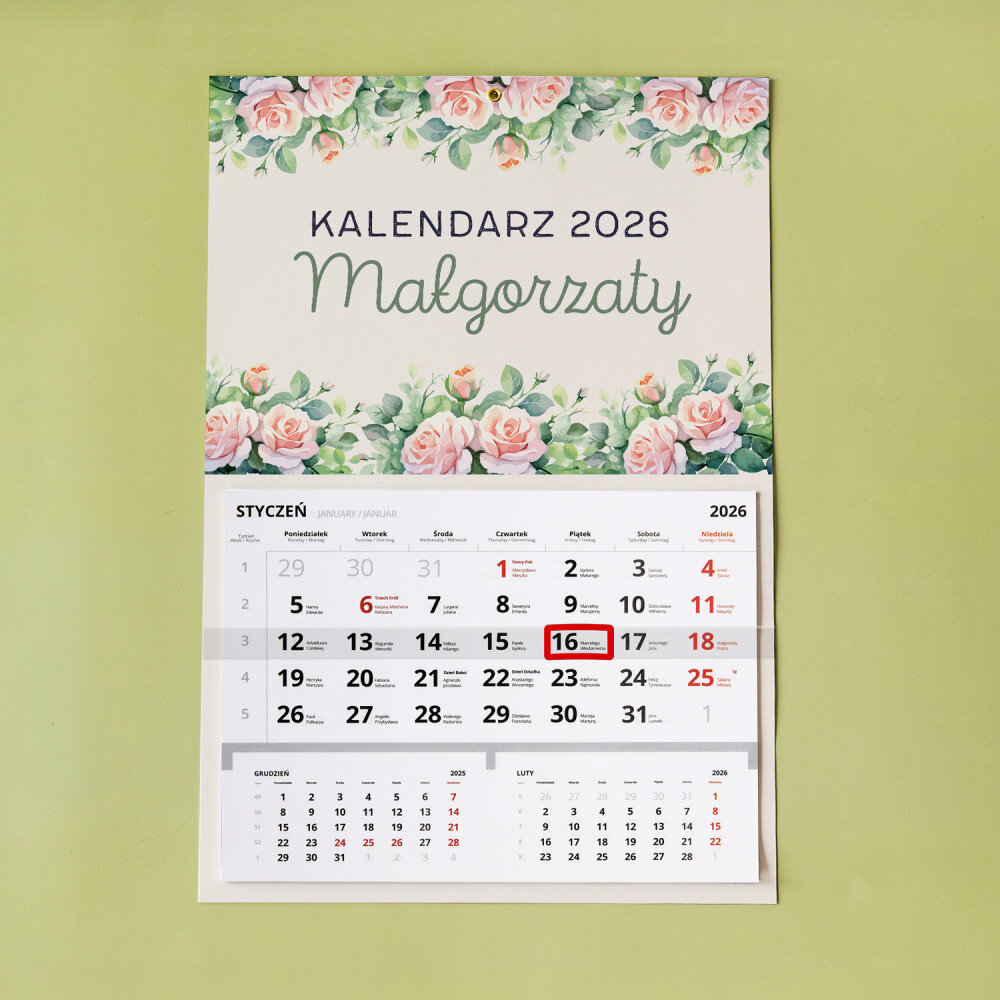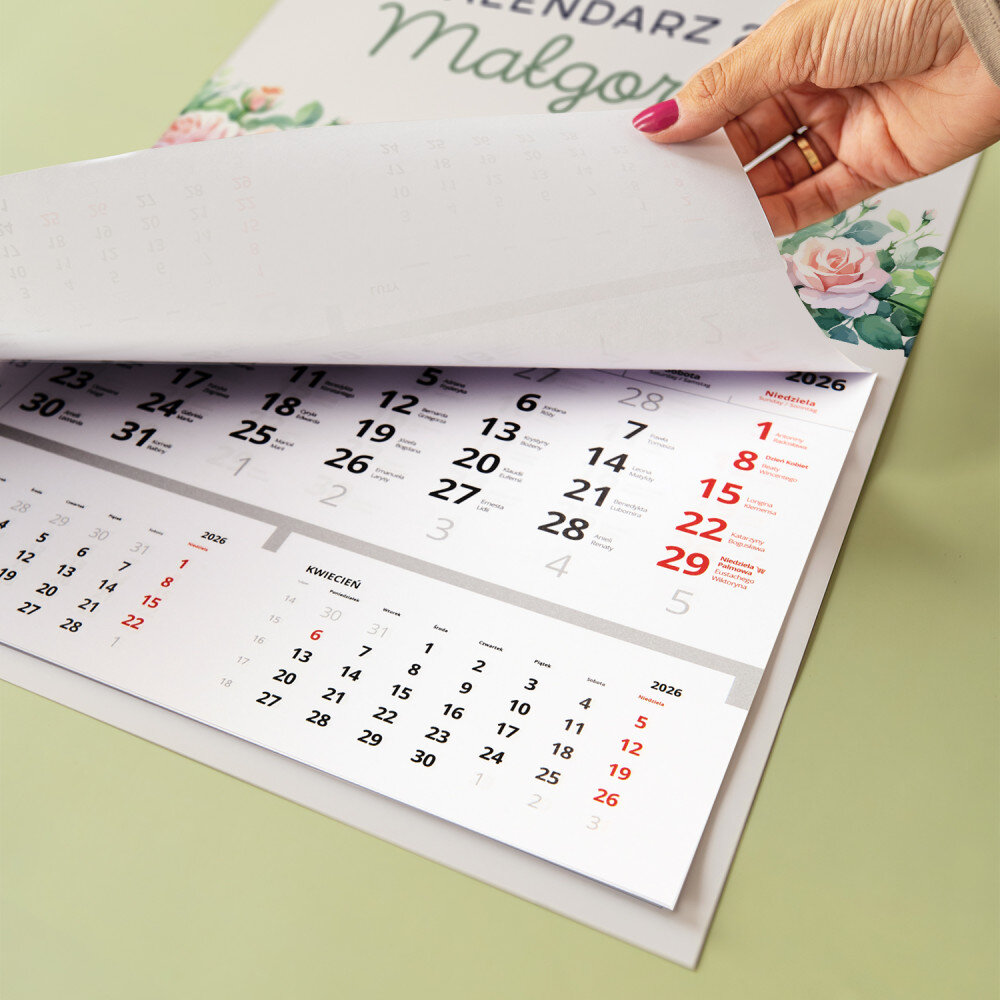 Personalizowany kalendarz jednodzielny to świetny pomysł na prezent, który idealnie sprawdzi się w każdym wnętrzu! Każdy miesiąc jest na oddzielnej kartce do wyrwania. Do zaznaczania aktualnej daty jest dołączony pasek z okienkiem. Nadruk wykonany na papierze foto wygląda pięknie, kolory są nasycone, a efekt trwały. Jest to idealny upominek i pamiątka w jednym!Wymiary: 45 x 30 cm