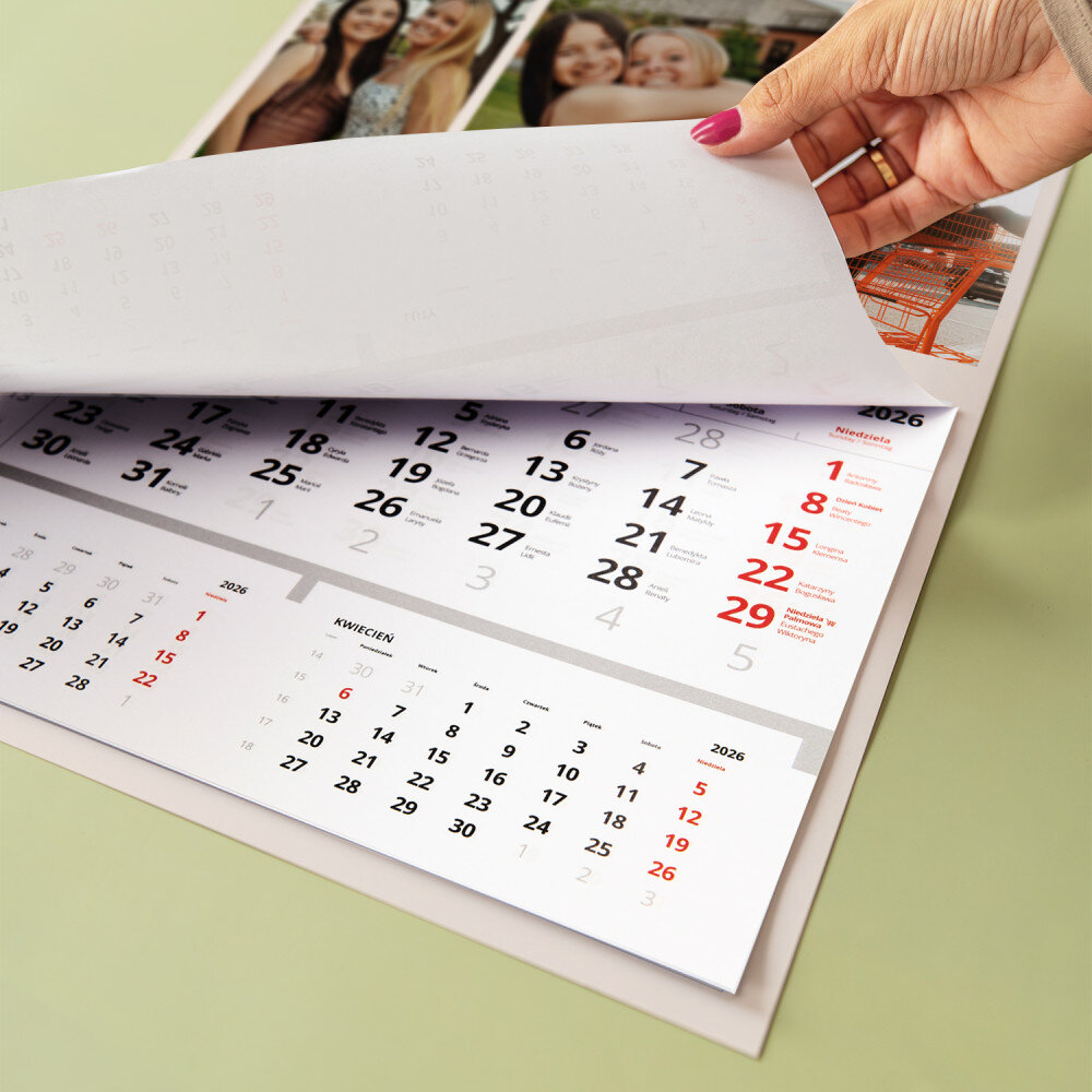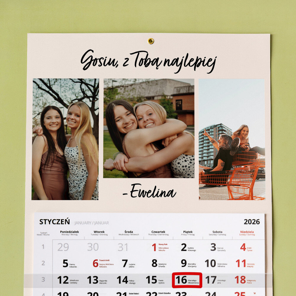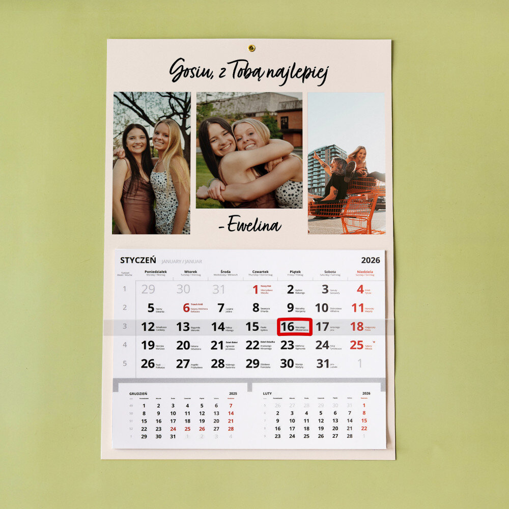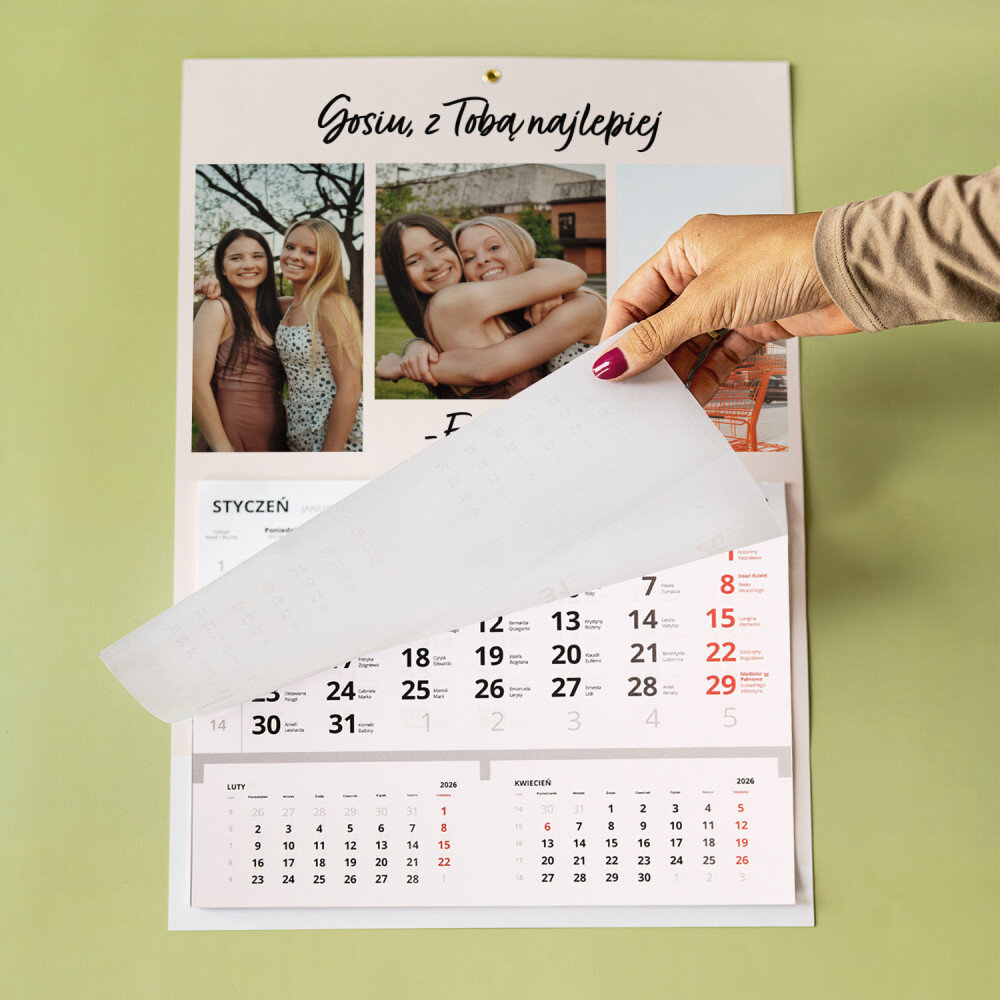 Personalizowany kalendarz jednodzielny to świetny pomysł na prezent, który idealnie sprawdzi się w każdym wnętrzu! Każdy miesiąc jest na oddzielnej kartce do wyrwania. Do zaznaczania aktualnej daty jest dołączony pasek z okienkiem. Nadruk wykonany na papierze foto wygląda pięknie, kolory są nasycone, a efekt trwały. Jest to idealny upominek i pamiątka w jednym!Wymiary: 45 x 30 cm