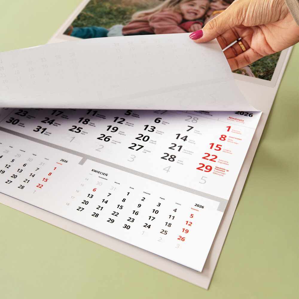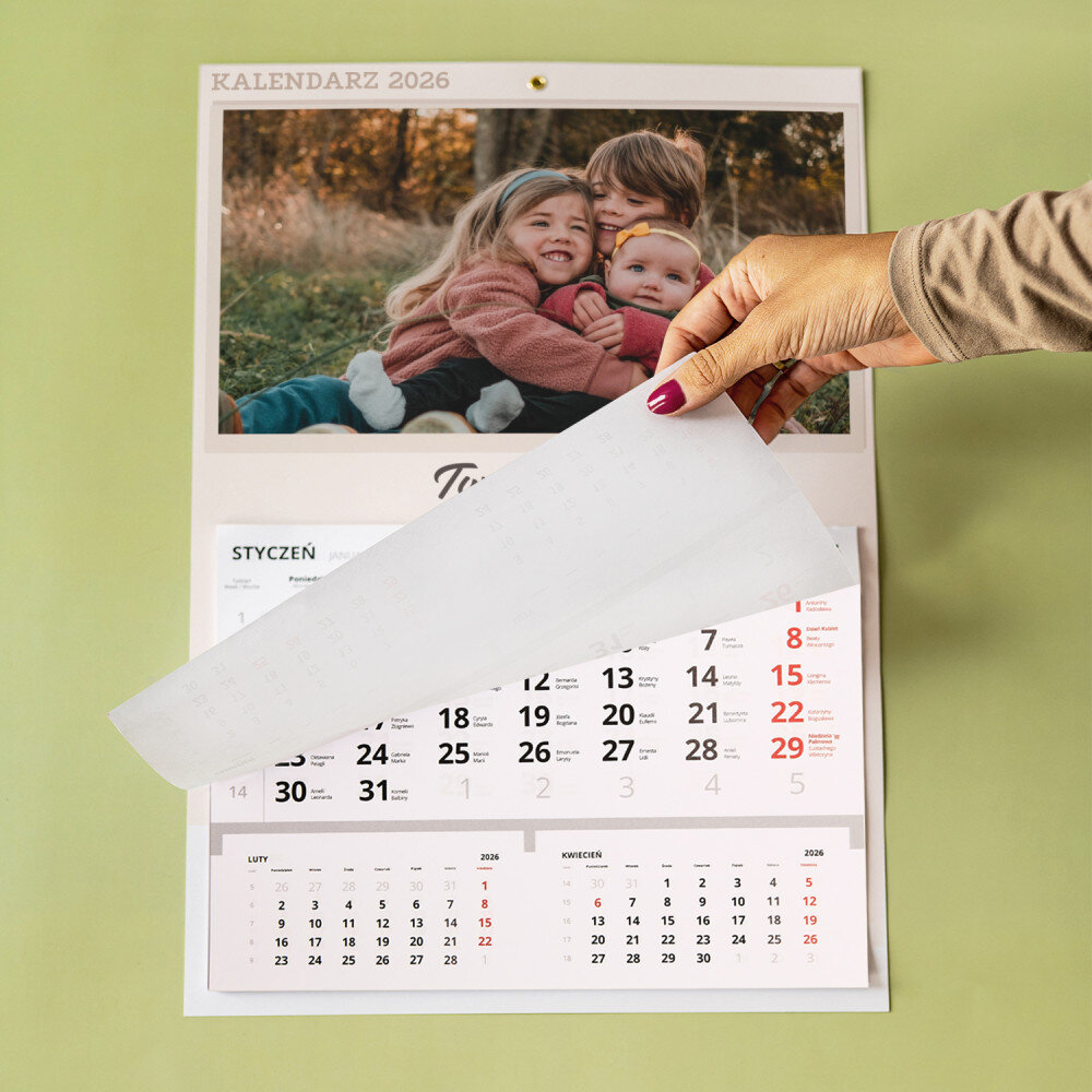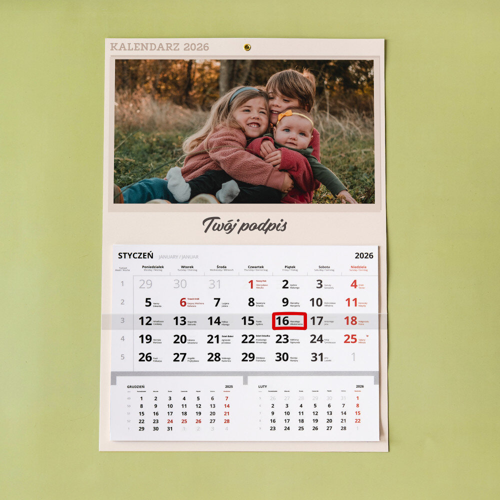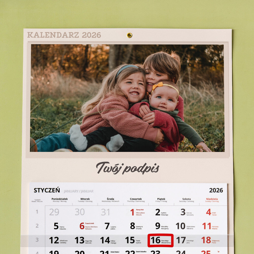 Personalizowany kalendarz jednodzielny to świetny pomysł na prezent, który idealnie sprawdzi się w każdym wnętrzu! Każdy miesiąc jest na oddzielnej kartce do wyrwania. Do zaznaczania aktualnej daty jest dołączony pasek z okienkiem. Nadruk wykonany na papierze foto wygląda pięknie, kolory są nasycone, a efekt trwały. Jest to idealny upominek i pamiątka w jednym!Wymiary: 45 x 30 cm
