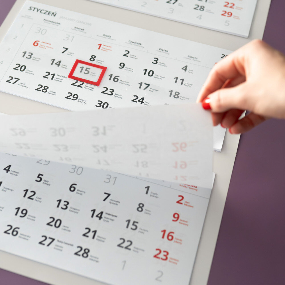 Trójdzielny kalendarz z wybraną personalizacją.