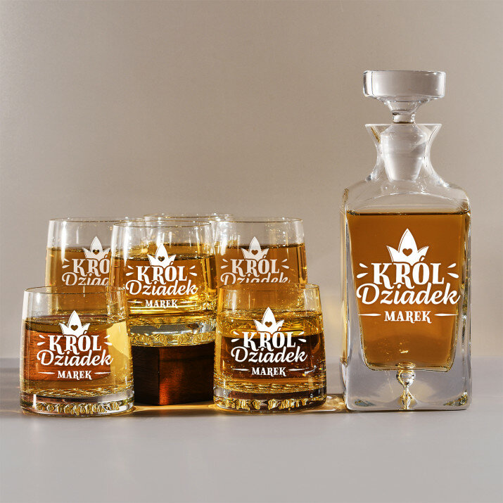 Zestaw z grawerowaną karafką i szklankami dostępny w czterech wariantach:Karafka + 1 szklanka