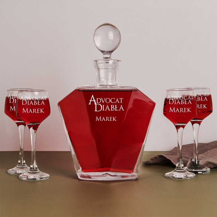 Chcesz podarować coś wyjątkowego osobie, której nalewki i likiery są wyśmienite i nie powstydziłby się ich sam diabeł? Zestaw karafka i kieliszki do nalewek będą doskonałym prezentem dla tego "advocata" diabła!WYKONANIE