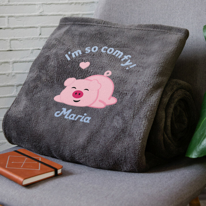 Koc o wymiarach 140 x 200 cm w kolorze szarym lub różowym, wykonany z wysokogatunkowego polaru, charakteryzuje się niepowtarzalną puszystością i miękkością, ozdobiony jednym z naszych personalizowanych haftowanych wzorów.