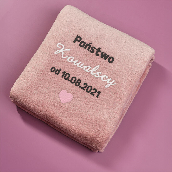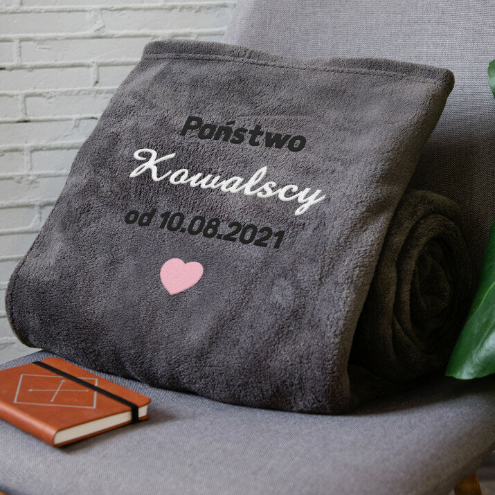 Koc o wymiarach 140 x 200 cm w kolorze szarym lub różowym, wykonany z wysokogatunkowego polaru, charakteryzuje się niepowtarzalną puszystością i miękkością, ozdobiony jednym z naszych personalizowanych haftowanych wzorów.