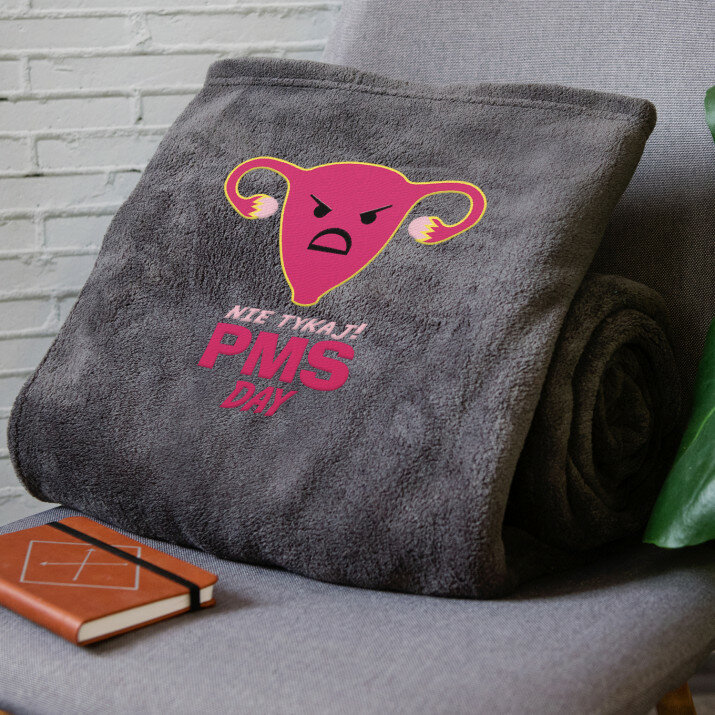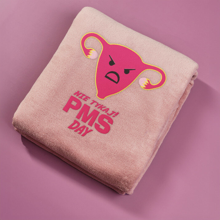 śmieszny Prezent dla Dziewczyny. Od tej pory za pomocą kocyka będzie mogła poinformować Cię, że akurat dzisiaj nie masz co liczyć na szaleństwa i lepiej, żebyś jej nie zaczepiał. A pomijając to, kocyk jest świetny, mięciutki i na pewno jej się spodoba.