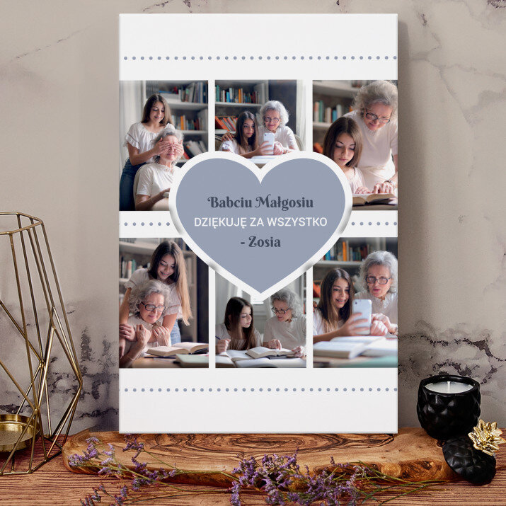 Piękna kompozycja Twoich zdjęć z kilkoma słowami prosto z serca oraz podpisami. Idealny prezent dla tych, z którymi łączy Cię mnóstwo wspomnień. Wystarczy wybrać ulubione fotografie najważniejszych dla Was chwil, a powstanie pamiątka, która zostanie z obdarowaną osobą na zawsze. To również niezwykle oryginalna i efektowna dekoracja do mieszkania.WYKONANIE