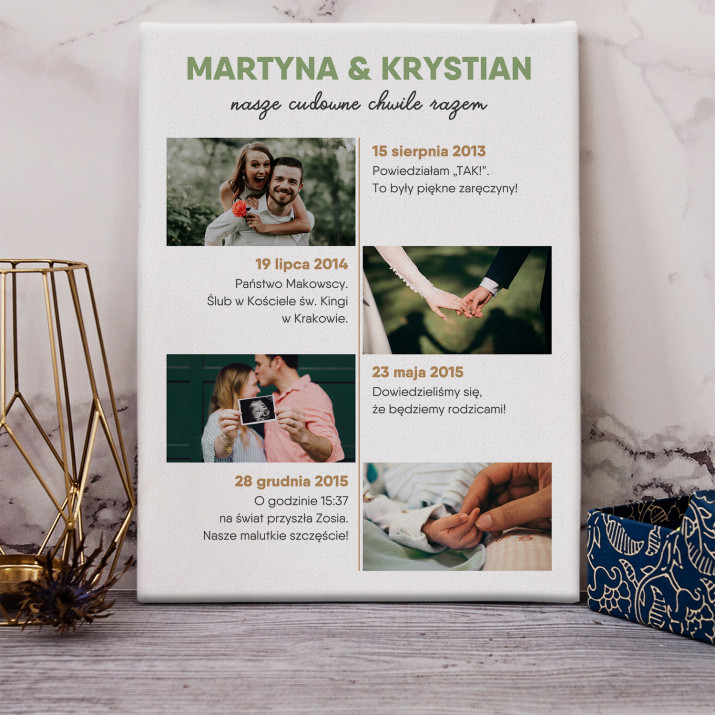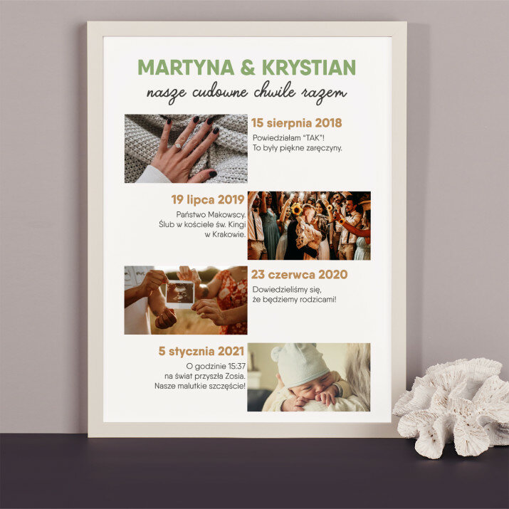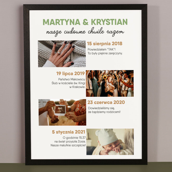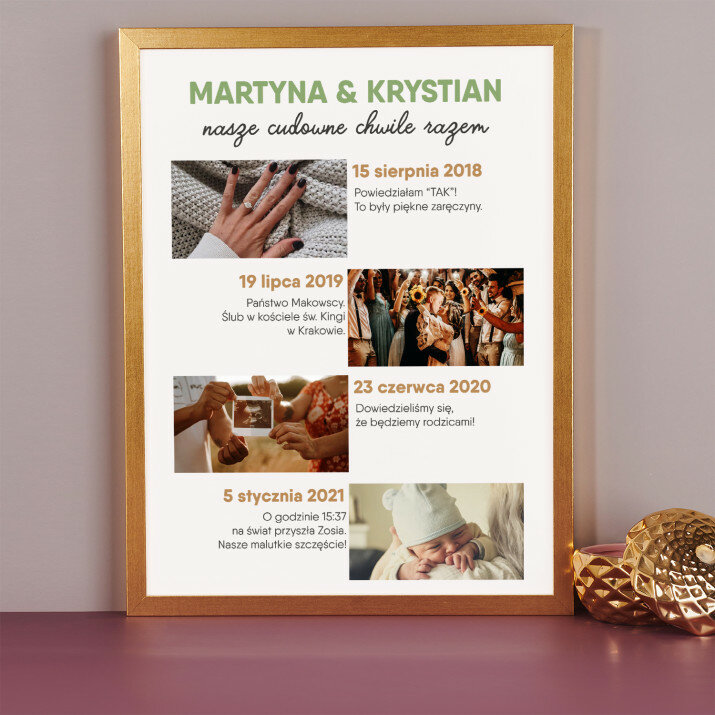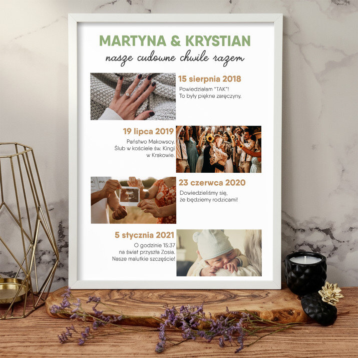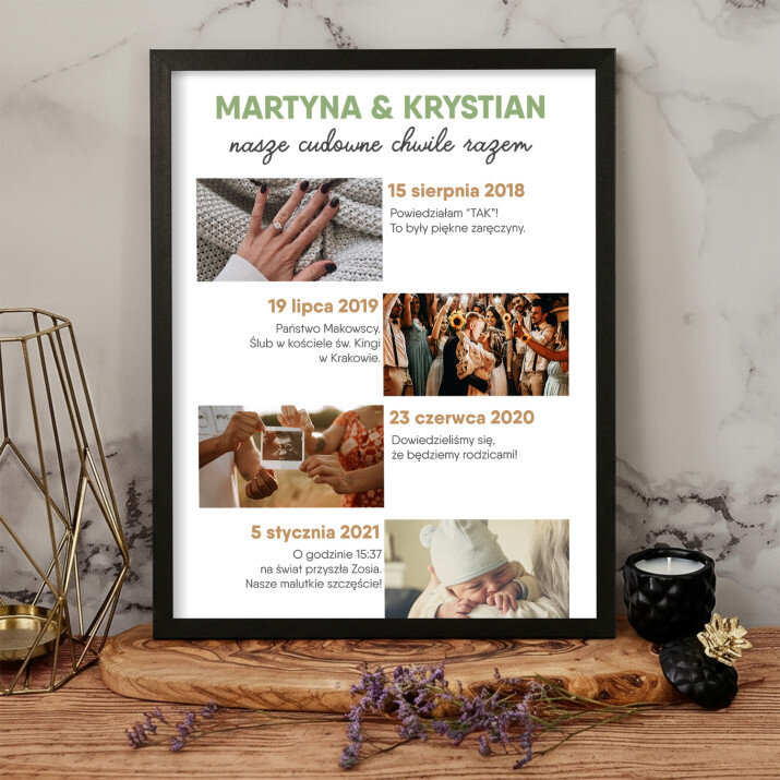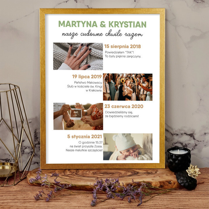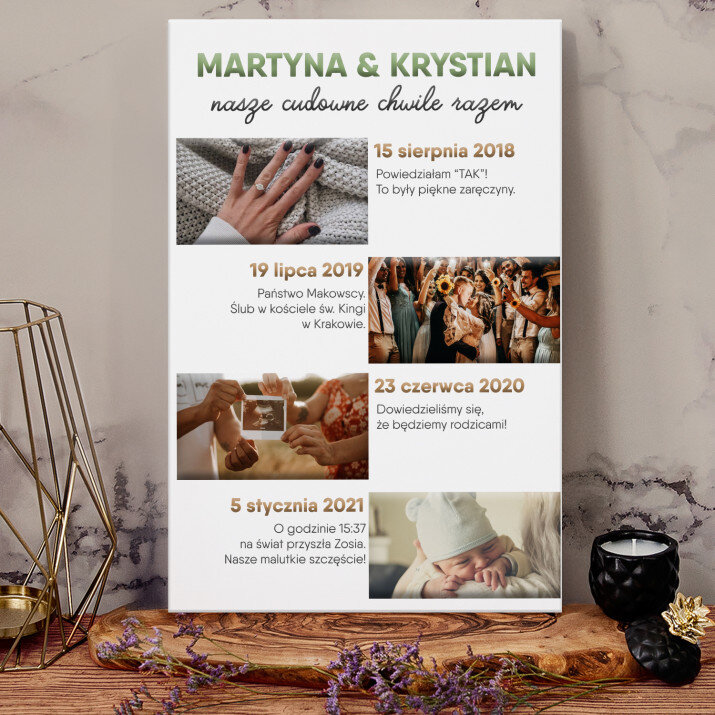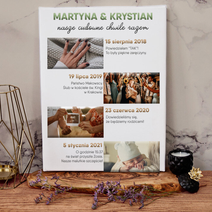 Piękna kompozycja Twoich zdjęć z kilkoma słowami prosto z serca oraz podpisami. Idealny prezent dla tych, z którymi łączy Cię mnóstwo wspomnień. Wystarczy wybrać ulubione fotografie najważniejszych dla Was chwil, a powstanie pamiątka, która zostanie z obdarowaną osobą na zawsze. To również niezwykle oryginalna i efektowna dekoracja do mieszkania.WYKONANIE