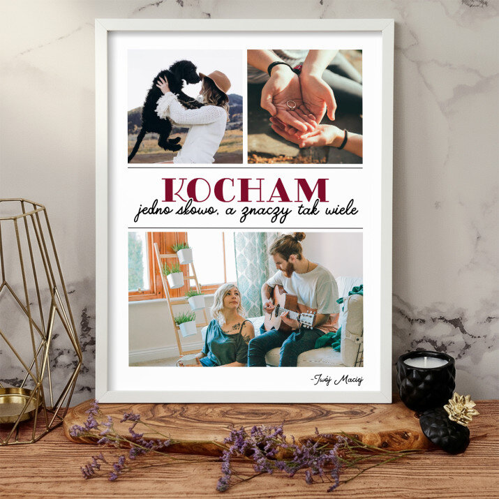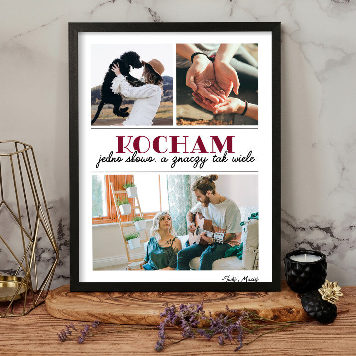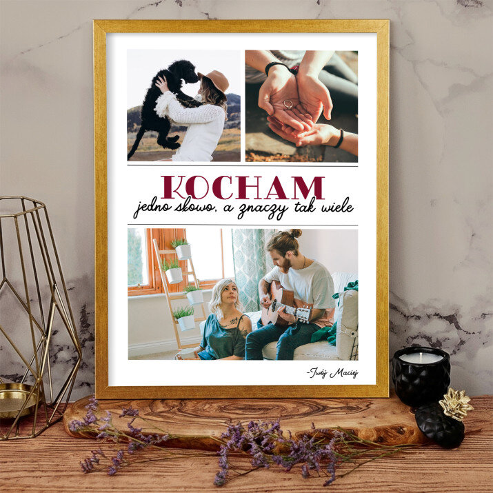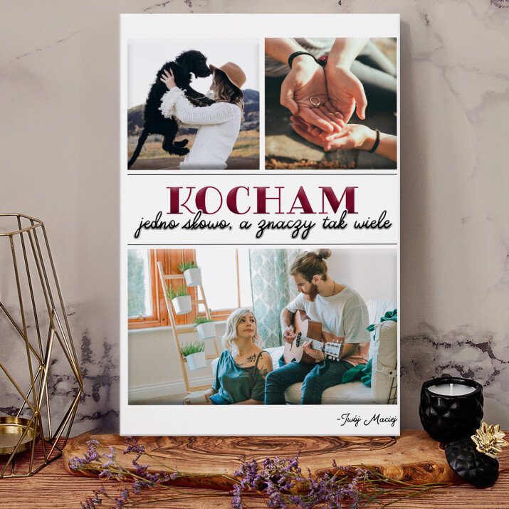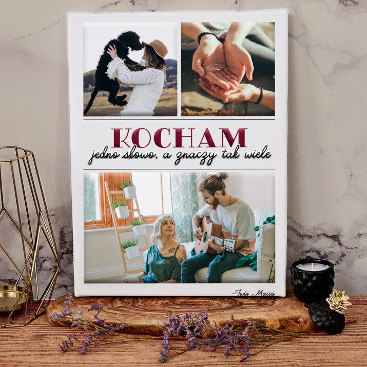 Piękna kompozycja Twoich zdjęć z kilkoma słowami prosto z serca oraz podpisami. Idealny prezent dla tych, z którymi łączy Cię mnóstwo wspomnień. Wystarczy wybrać ulubione fotografie najważniejszych dla Was chwil, a powstanie pamiątka, która zostanie z obdarowaną osobą na zawsze. To również niezwykle oryginalna i efektowna dekoracja do mieszkania.WYKONANIE