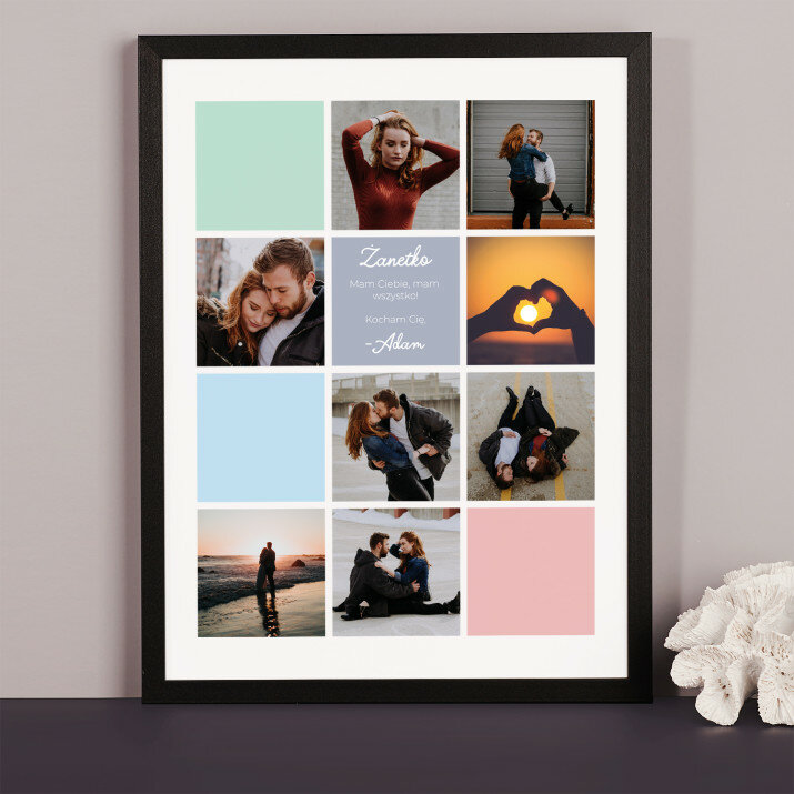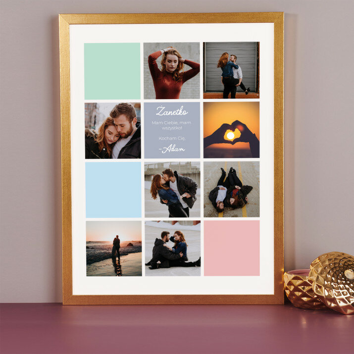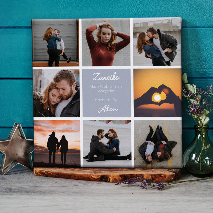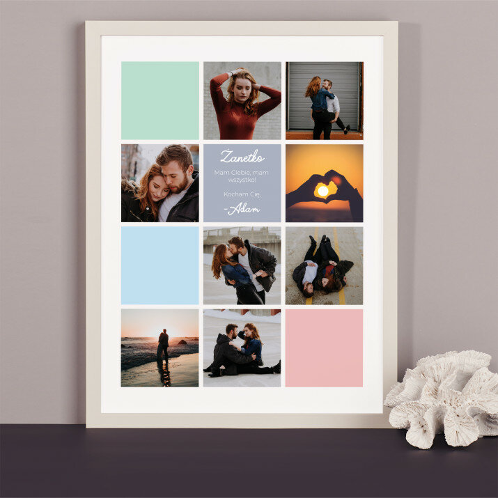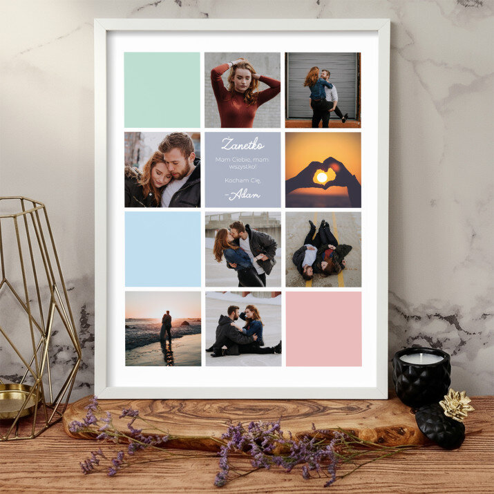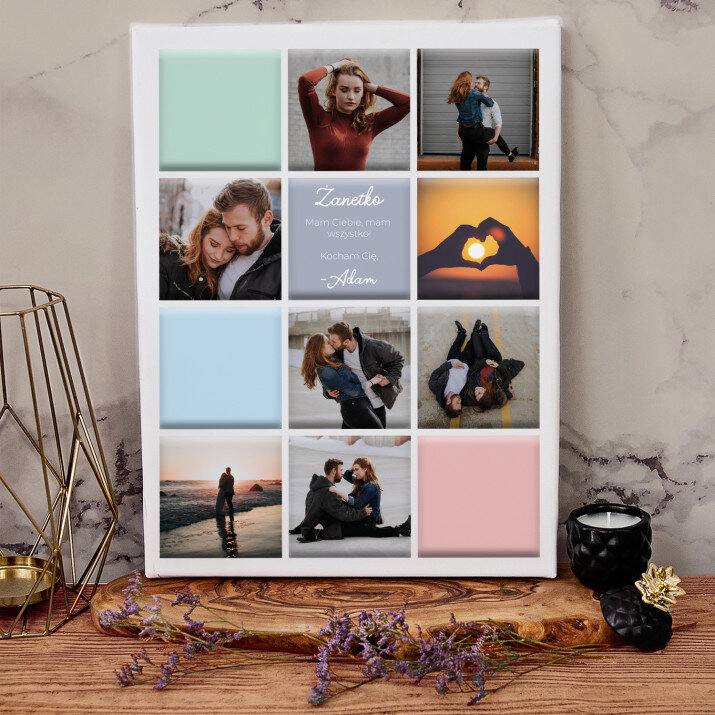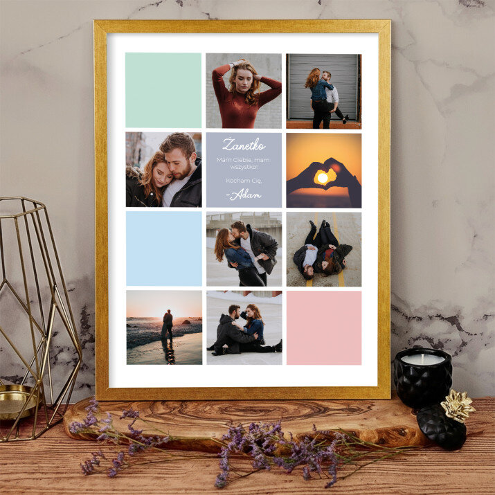 Piękna kompozycja Twoich zdjęć z kilkoma słowami prosto z serca oraz podpisami. Idealny prezent dla tych, z którymi łączy Cię mnóstwo wspomnień. Wystarczy wybrać ulubione fotografie najważniejszych dla Was chwil, a powstanie pamiątka, która zostanie z obdarowaną osobą na zawsze. To również niezwykle oryginalna i efektowna dekoracja do mieszkania.WYKONANIE
