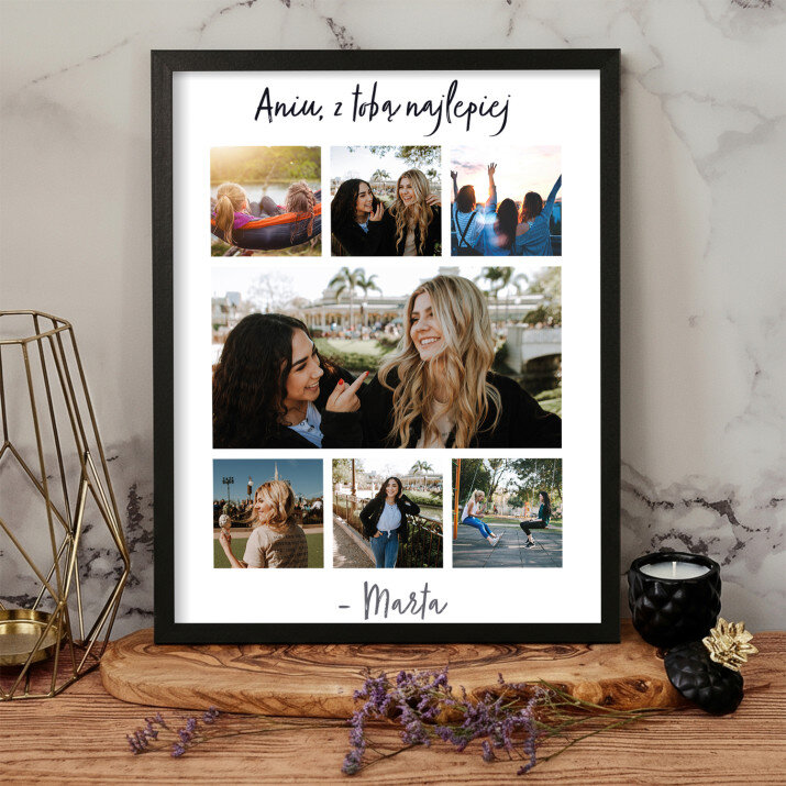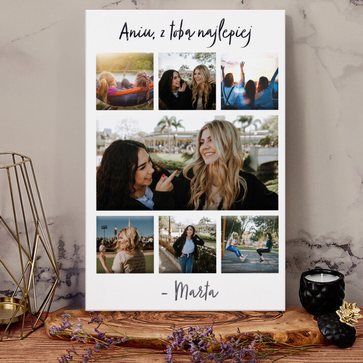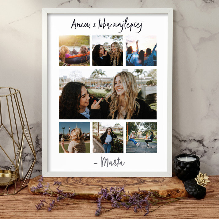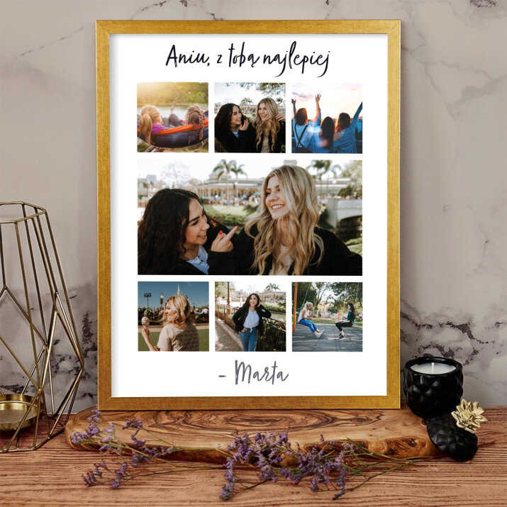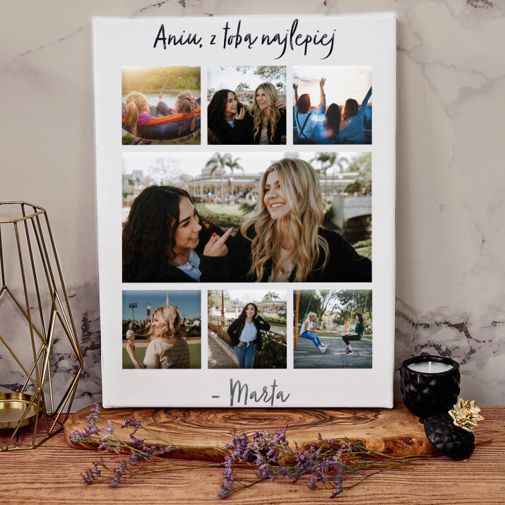 Piękna kompozycja Twoich zdjęć z kilkoma słowami prosto z serca oraz podpisami. Idealny prezent dla tych, z którymi łączy Cię mnóstwo wspomnień. Wystarczy wybrać ulubione fotografie najważniejszych dla Was chwil, a powstanie pamiątka, która zostanie z obdarowaną osobą na zawsze. To również niezwykle oryginalna i efektowna dekoracja do mieszkania.WYKONANIE