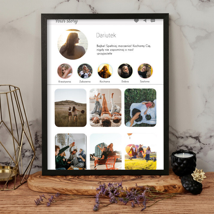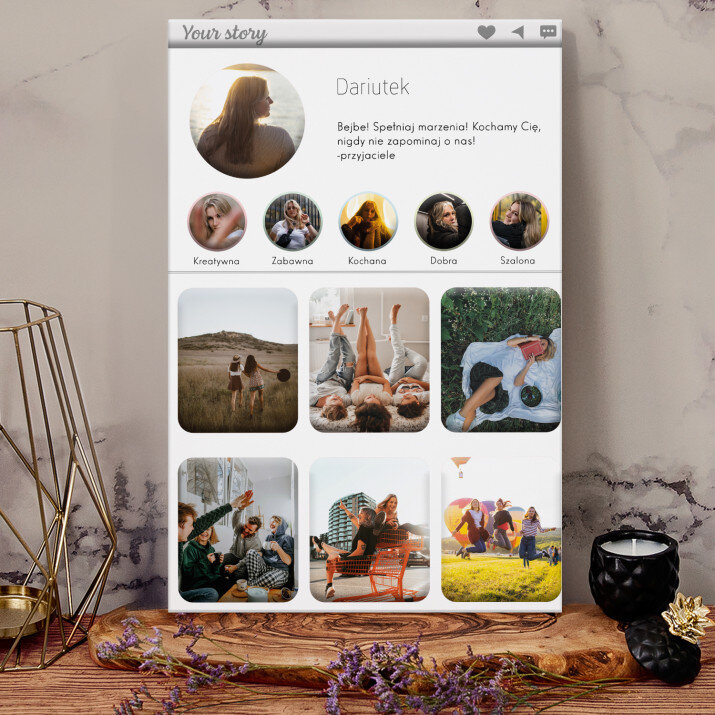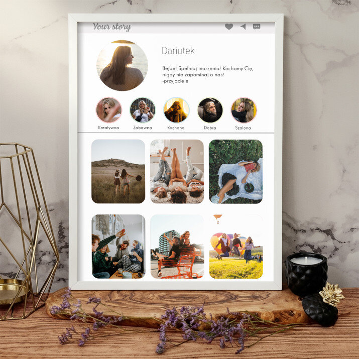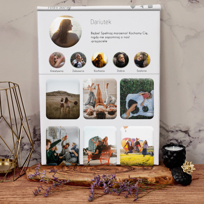 Piękna kompozycja Twoich zdjęć z kilkoma słowami prosto z serca oraz podpisami. Idealny prezent dla tych, z którymi łączy Cię mnóstwo wspomnień. Wystarczy wybrać ulubione fotografie najważniejszych dla Was chwil, a powstanie pamiątka, która zostanie z obdarowaną osobą na zawsze. To również niezwykle oryginalna i efektowna dekoracja do mieszkania.