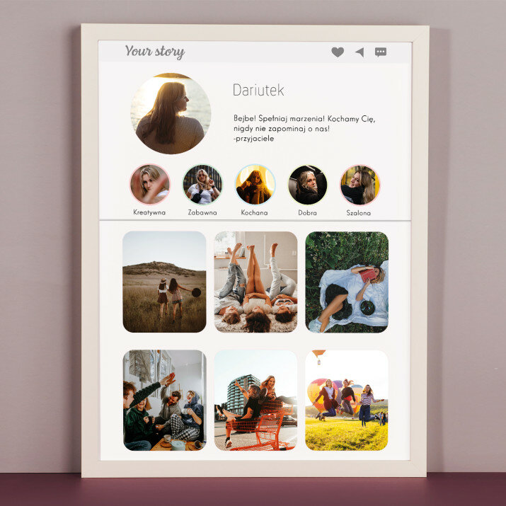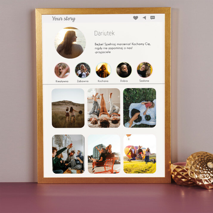 Piękna kompozycja Twoich zdjęć z kilkoma słowami prosto z serca oraz podpisami. Idealny prezent dla tych, z którymi łączy Cię mnóstwo wspomnień. Wystarczy wybrać ulubione fotografie najważniejszych dla Was chwil, a powstanie pamiątka, która zostanie z obdarowaną osobą na zawsze. To również niezwykle oryginalna i efektowna dekoracja do mieszkania.WYKONANIE