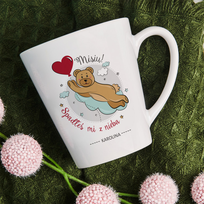 Oj, taki upadek z nieba musiał być nie tylko bolesny, ale także wyczerpujący. Wiemy jednak, co na pewno postawi na nogi Twojego Misia po takim locie - pyszna, aromatyczna kawa pita z romantycznego kubeczka podarowanego przez kochającą kobietę!Wykonanie