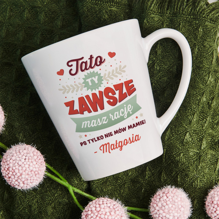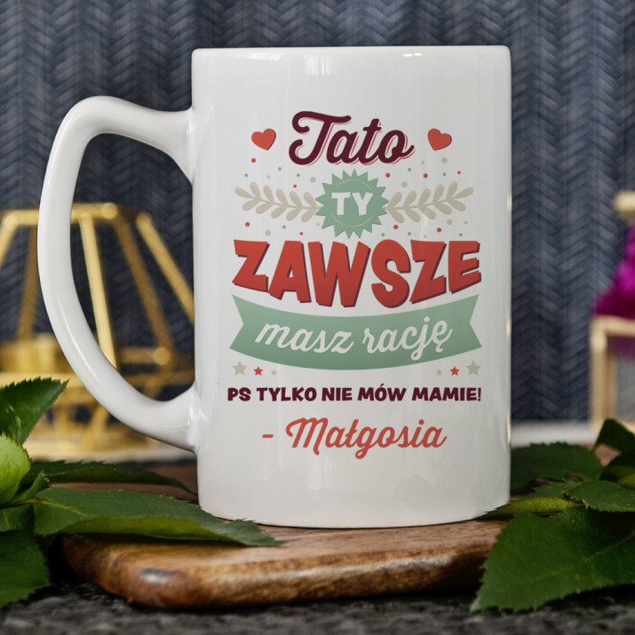Kubek z napisem Tato, ty masz zawsze rację to idealny sposób na wyrażenie miłości i szacunku. Praktyczny i pełen humoru.