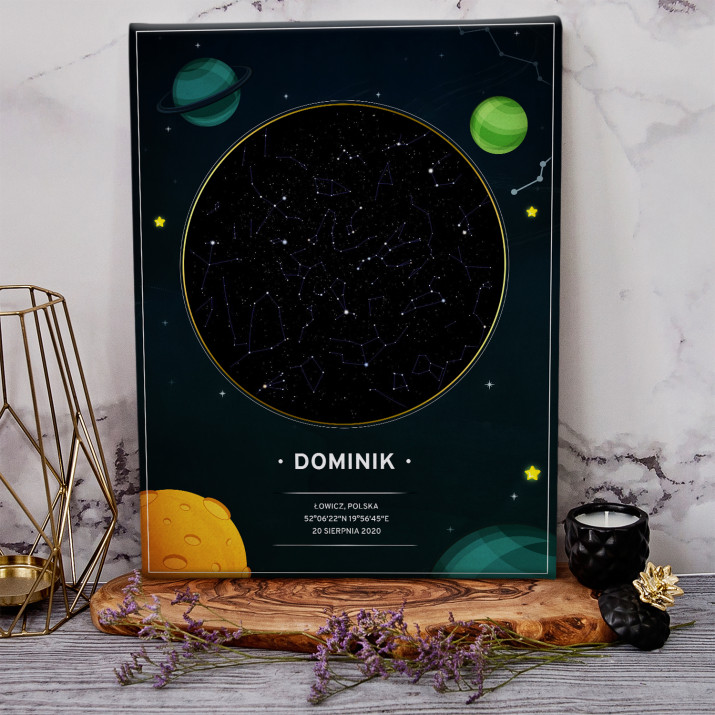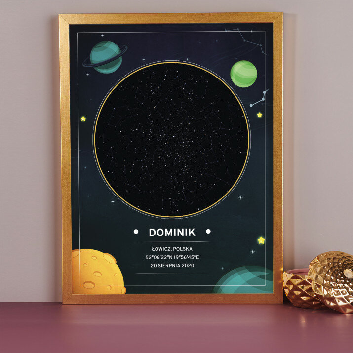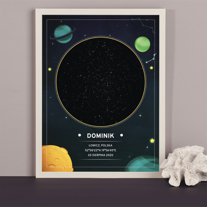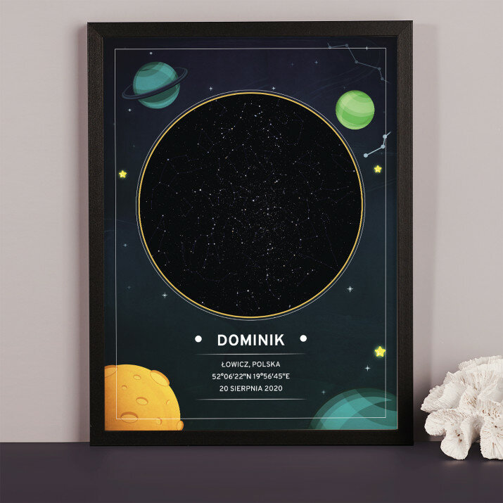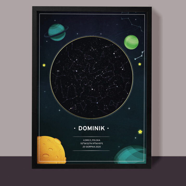 Wyjątkowy plakat w ramce lub obraz na płótnie to piękna i oryginalna pamiątka ważnego dla Ciebie momentu. Podanie wybranego miasta i daty pozwala odtworzyć wygląd nieba i układ gwiazd z tego dnia. Personalizacja obejmuje także podane przez Ciebie imiona, dedykację i inne elementy, dzięki którym taki wydruk stanie się bardzo osobistym i niepowtarzalnym podarunkiem.PERSONALIZACJA