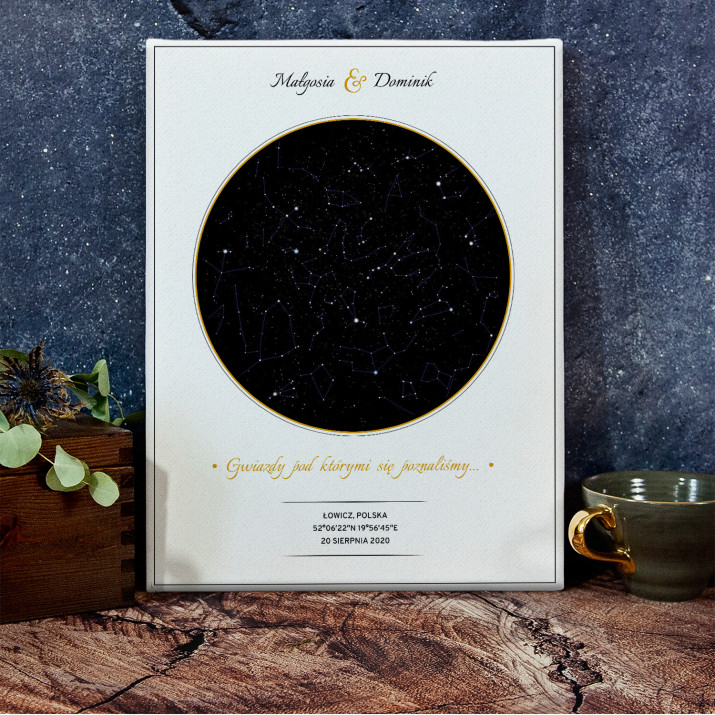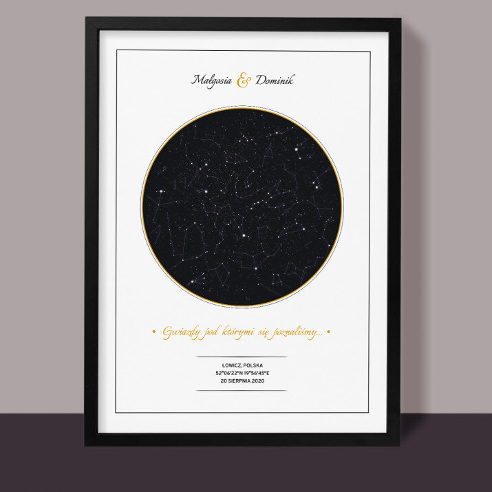 Wyjątkowy plakat w ramce lub obraz na płótnie to piękna i oryginalna pamiątka ważnego dla Ciebie momentu. Podanie wybranego miasta i daty pozwala odtworzyć wygląd nieba i układ gwiazd z tego dnia. Personalizacja obejmuje także podane przez Ciebie imiona, dedykację i inne elementy, dzięki którym taki wydruk stanie się bardzo osobistym i niepowtarzalnym podarunkiem.PERSONALIZACJA