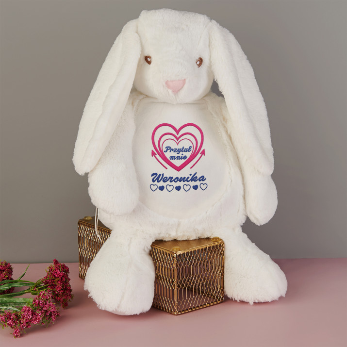 Duży i niezwykle miękki pluszak miś albo królik, ozdobiony jednym z naszych personalizowanych haftowanych wzorów. Zabawka pluszowa, skład: 100% poliester. Maskotka posiada unikalny zamek błyskawiczny, który umożliwia wyjęcie wnętrza i bezproblemowe czyszczenie. Miś jest bezpieczny dla dzieci w każdym wieku. Tylko pranie ręczne. Wysokość pluszaka: 45 cm.