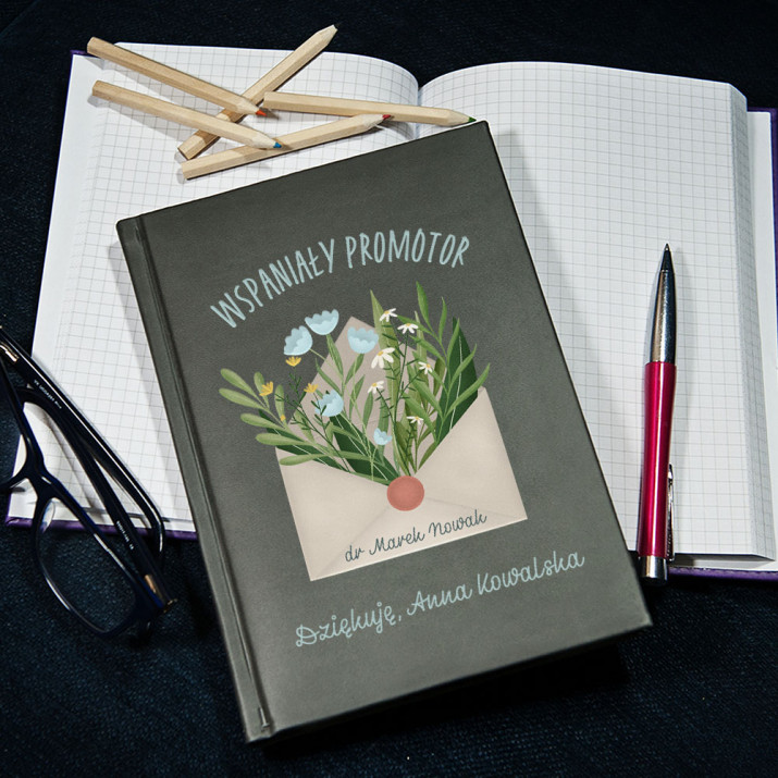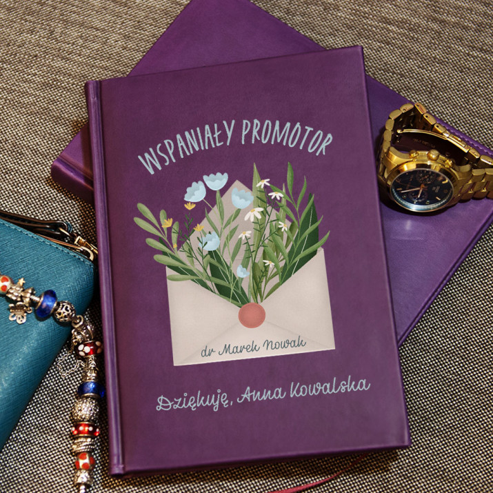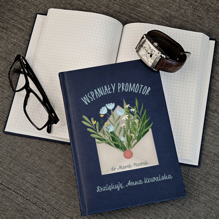 Notatnik książkowy w formacie A5 z wysokiej jakości nadrukiem UV.Notatnik wykończony jest miękkim materiałem i obszyty na brzegach.