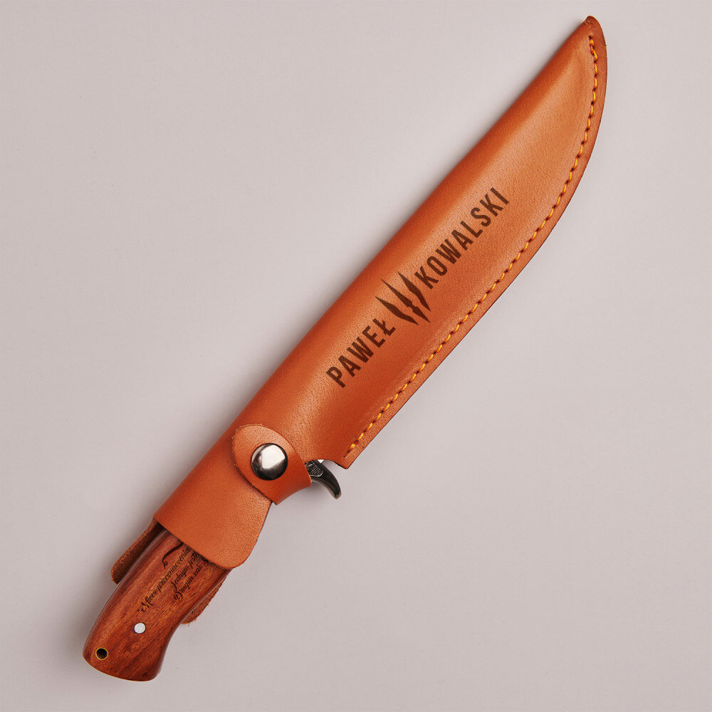 nigdy nas nie zawiedzie i sprawdzi się w każdych warunkach. Nóż posiada drewnianą rękojeść w kolorze brązowym oraz dopasowane, eleganckie etui wykonane z