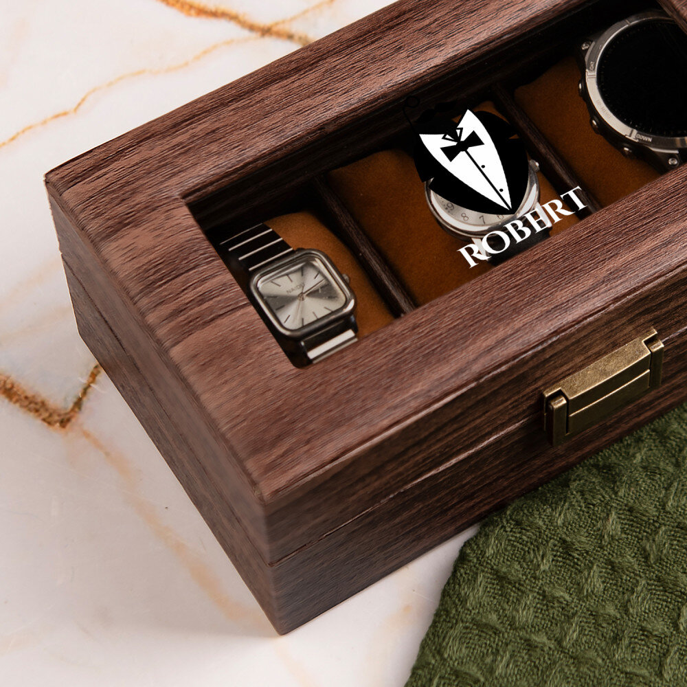 Ten organizer na zegarki z moim monogramem prezentuje się elegancko i pomaga w utrzymaniu porządku w mojej kolekcji zegarków.
