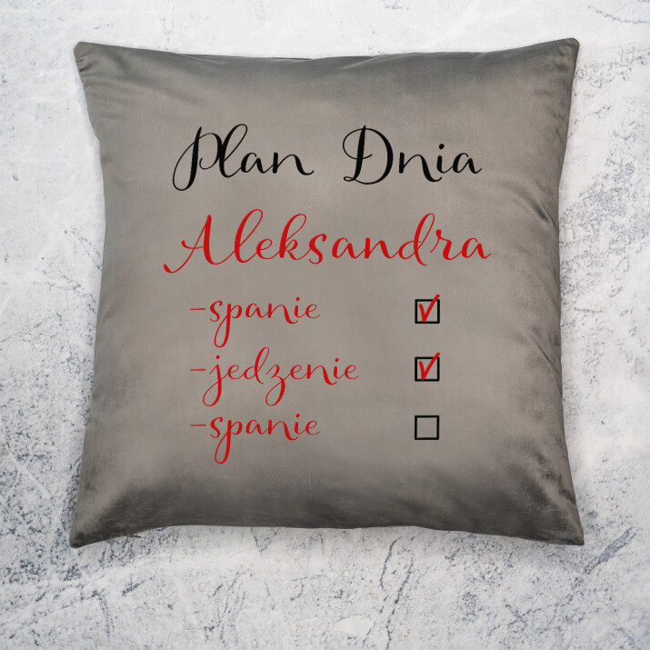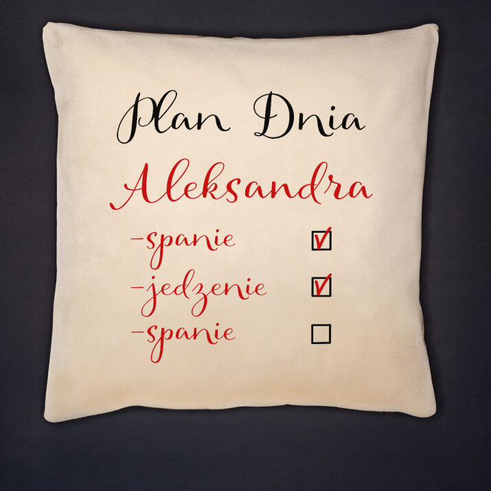 Dzień przyjemniej mija każdemu kto wcześniej go sobie zaplanował. Podaruj bliskiej osobie, która uwielbia spać, poduszkę z planem dnia. Taki prezent na pewno przypadnie jej do gustu!WYKONANIE
