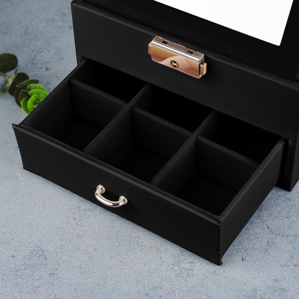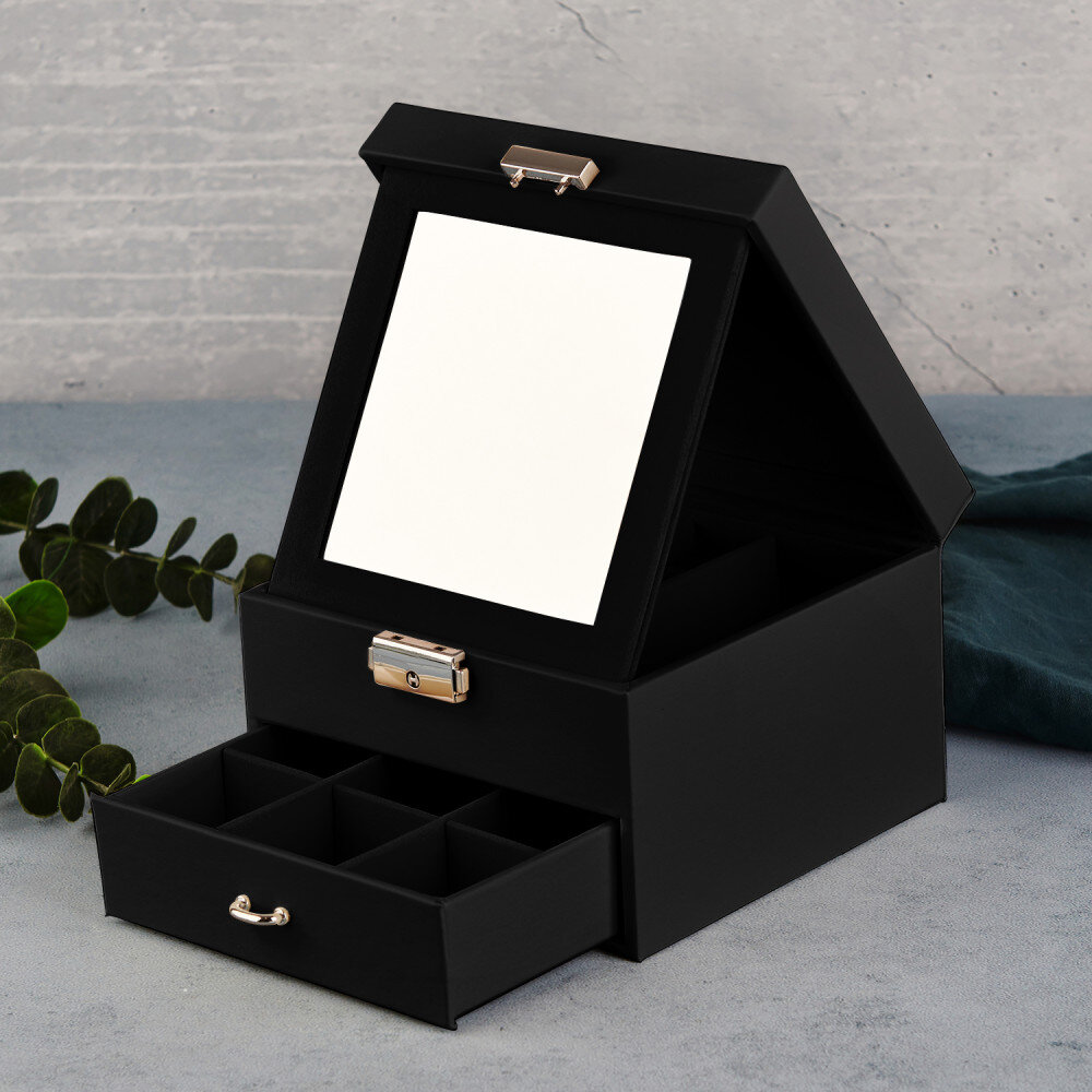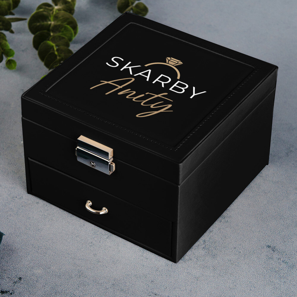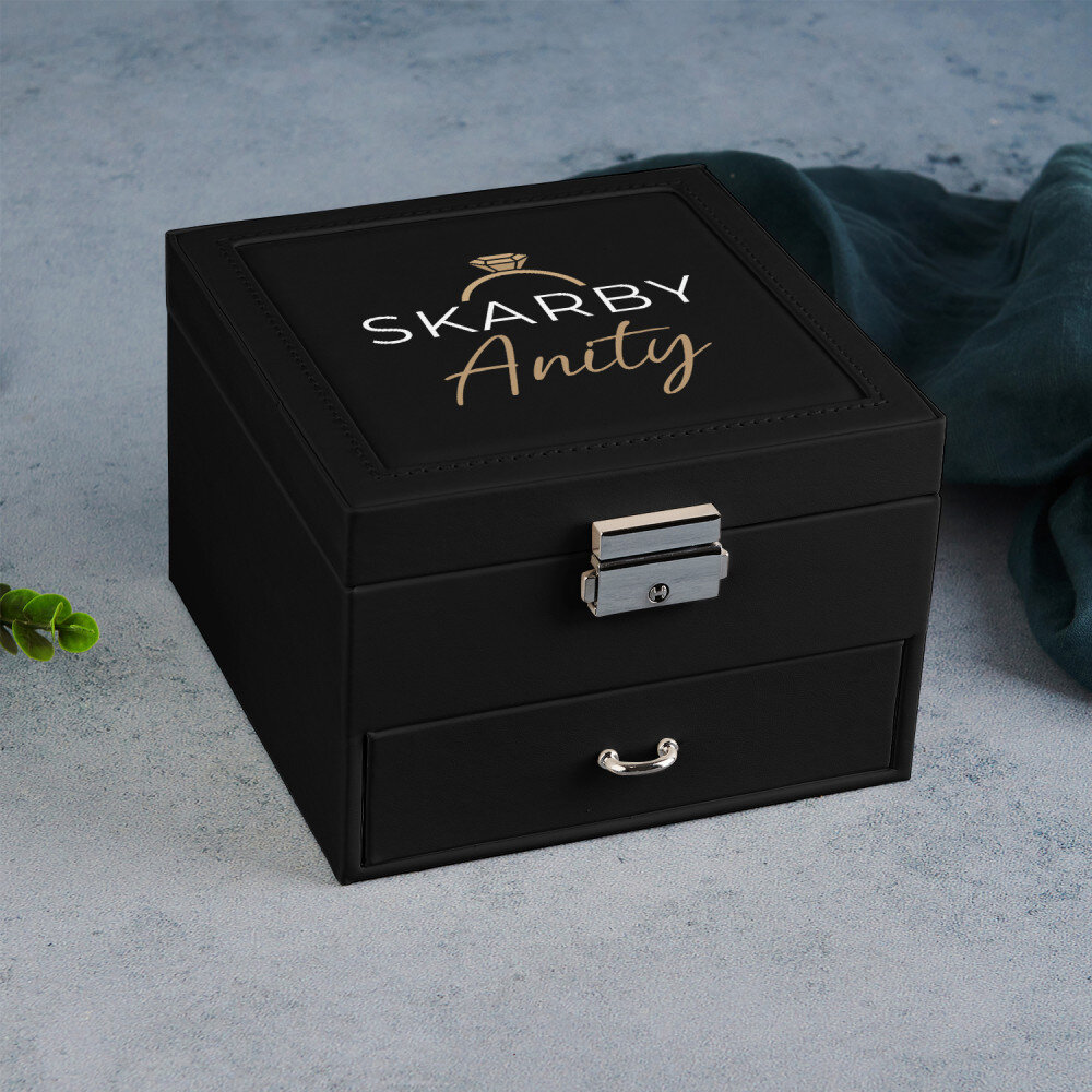 Szkatułkę na biżuterię charakteryzuje elegancka czarna oprawa, dzięki której całość prezentuję się estetycznie. Jej efektowny wygląd i nowoczesny design sprawiają, że organizer wkomponuje się znakomicie w wystrój każdego pokoju. Produkt cechuje się też funkcjonalnością! Szkatułka zawiera duże, zdejmowane lusterko, przy którym można robić makijaż albo przymierzać swoje ozdoby. Pudełko posiada również oddzielne przegródki i szuflady do przechowywania kolczyków, zegarków, łańcuszków itp. Środek wyłożony jest miękką wyściółką, która chroni najcenniejsze skarby przed porysowaniem, a zatrzask z metalu zapewnia bezpieczeństwo przedmiotom znajdującym się w środku. Szkatułka to niezawodny prezent dla każdej damy! Na powierzchni przedmiotu umieszczany jest personalizowany nadruk, który nadaje wyjątkowego charakteru!Wysokość szkatułki: 5 cm