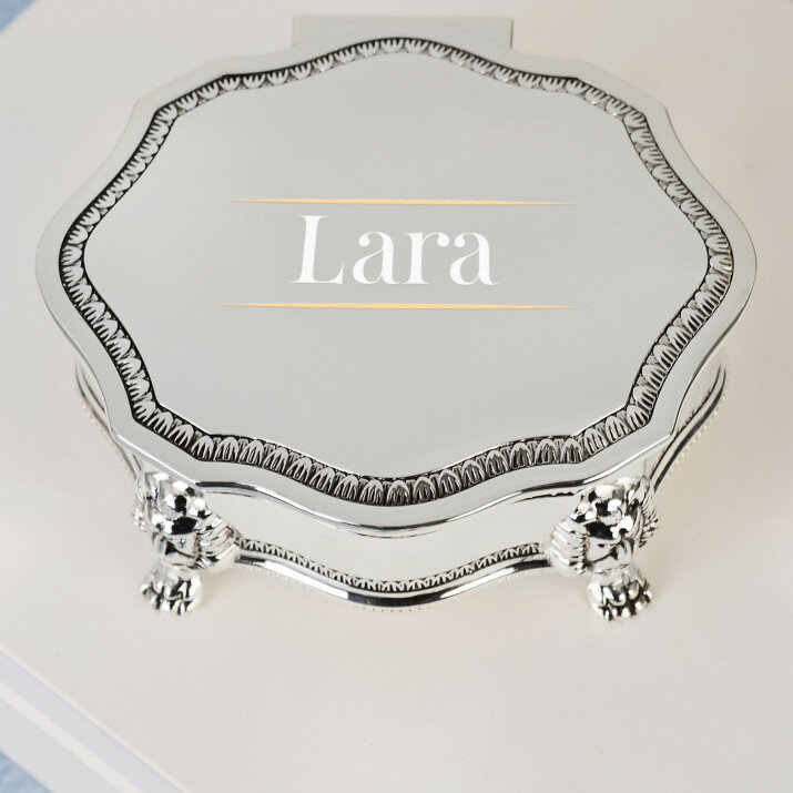 Pięknie zdobiona posrebrzana szkatułka na biżuterię.