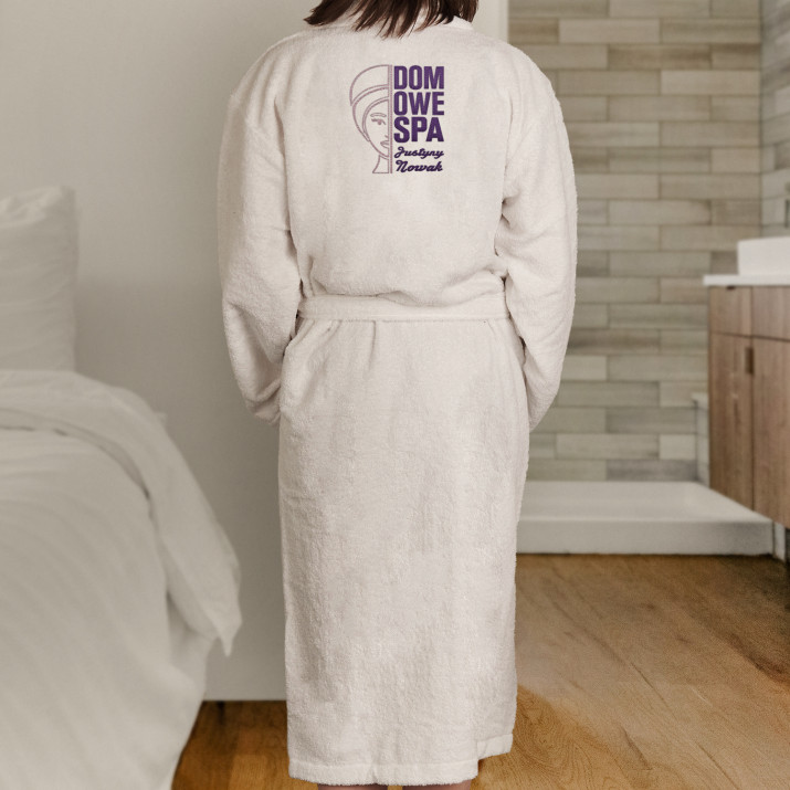 Uniwersalny szlafrok w kolorze białym, wykonany ze 100% bawełny frotte. Wygodny, ładny, mięciutki - zapewni doskonały komfort, gdy wszystkie troski dnia odejdą w dal i nadejdzie czas na relaks. Ogrzeje również zaspane ciałko zaraz po przebudzeniu. Szlafrok ozdobiony jest personalizowanym haftem, który pięknie wygląda, poprawia samopoczucie i zamienia produkt w wyjątkowy upominek!Szlafrok ma elegancki fason z kołnierzykiem i kieszeniami, aby można było zabłysnąć na wieczornym pokazie mody podomowej. Rozmiar szlafroka uniwersalny, gramatura 350 g/m2. Unisex.