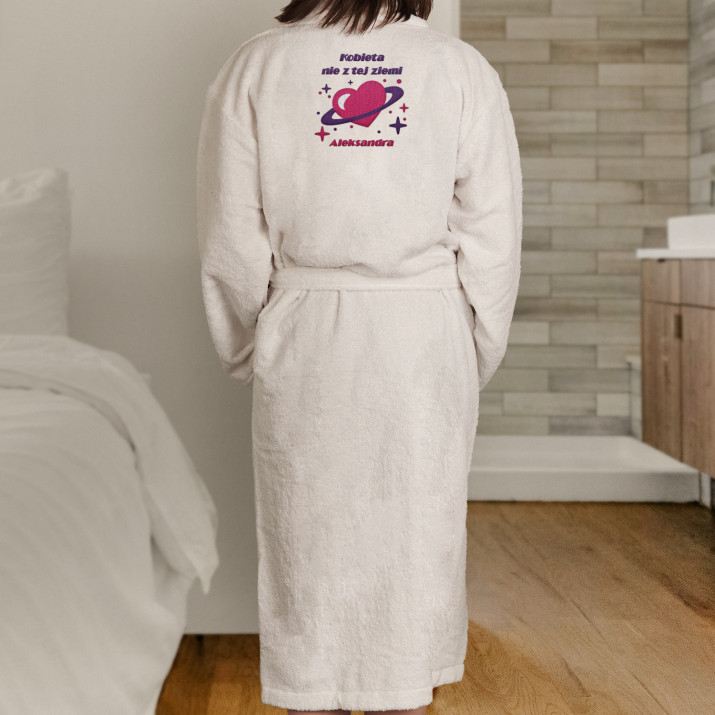 Uniwersalny szlafrok w kolorze białym, wykonany ze 100% bawełny frotte. Wygodny, ładny, mięciutki - zapewni doskonały komfort, gdy wszystkie troski dnia odejdą w dal i nadejdzie czas na relaks. Ogrzeje również zaspane ciałko zaraz po przebudzeniu. Szlafrok ozdobiony jest personalizowanym haftem, który pięknie wygląda, poprawia samopoczucie i zamienia produkt w wyjątkowy upominek!Szlafrok ma elegancki fason z kołnierzykiem i kieszeniami, aby można było zabłysnąć na wieczornym pokazie mody podomowej. Rozmiar szlafroka uniwersalny, gramatura 350 g/m2. Unisex.