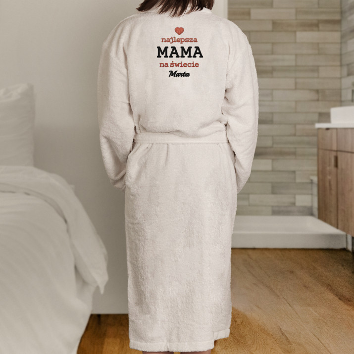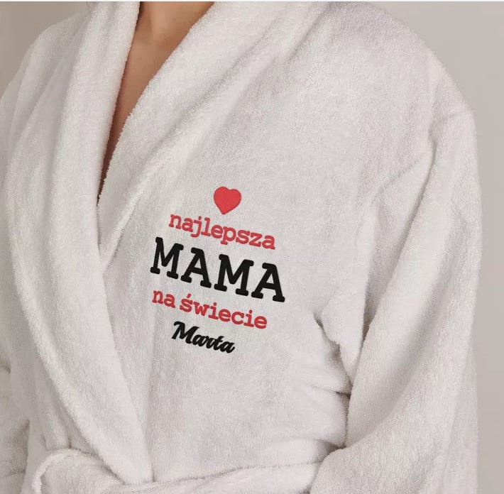 Uniwersalny szlafrok w kolorze białym, wykonany ze 100% bawełny frotte. Wygodny, ładny, mięciutki - zapewni doskonały komfort, gdy wszystkie troski dnia odejdą w dal i nadejdzie czas na relaks. Ogrzeje również zaspane ciałko zaraz po przebudzeniu. Szlafrok ozdobiony jest personalizowanym haftem, który pięknie wygląda, poprawia samopoczucie i zamienia produkt w wyjątkowy upominek!Szlafrok ma elegancki fason z kołnierzykiem i kieszeniami, aby można było zabłysnąć na wieczornym pokazie mody podomowej. Rozmiar szlafroka uniwersalny, gramatura 350 g/m2. Unisex.