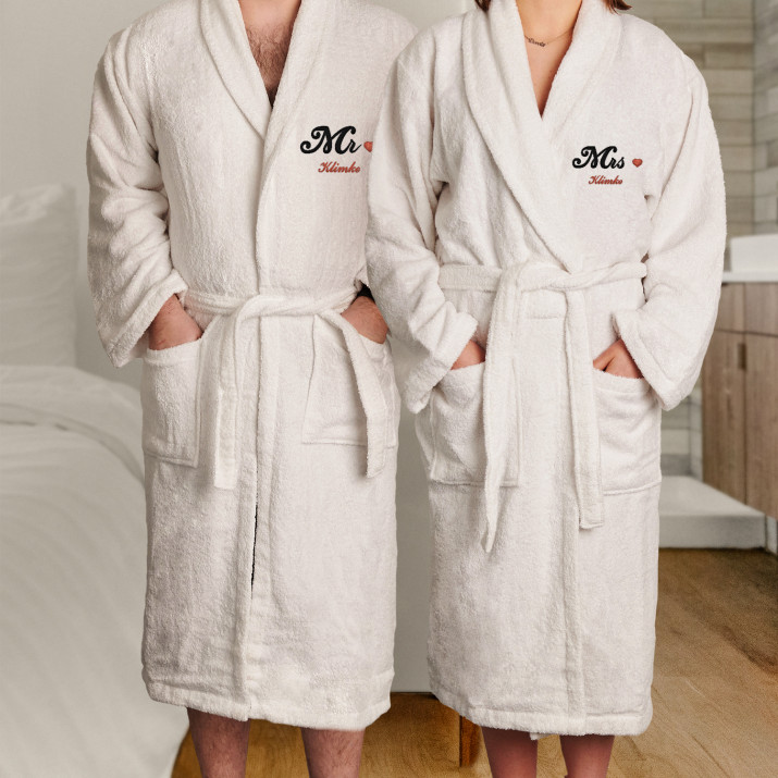 Dwa uniwersalne szlafroki w kolorze białym, wykonane ze 100% bawełny frotte. Wygodne, ładne, mięciutkie - zapewnią doskonały komfort, gdy wszystkie troski dnia odejdą w dal i nadejdzie czas na relaks. Ogrzeją również zaspane ciałka zaraz po przebudzeniu. Szlafroki ozdobione są personalizowanymi haftami, które pięknie wyglądają, poprawiają samopoczucie i zamieniają produkt w wyjątkowy upominek!Każdy szlafrok ma elegancki fason z kołnierzykiem i kieszeniami, aby można było zabłysnąć na wieczornym pokazie mody podomowej. Rozmiar szlafroka uniwersalny, gramatura 350 g/m2. Unisex.