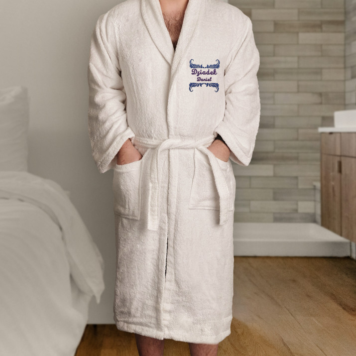 Uniwersalny szlafrok w kolorze białym, wykonany ze 100% bawełny frotte. Wygodny, ładny, mięciutki - zapewni doskonały komfort, gdy wszystkie troski dnia odejdą w dal i nadejdzie czas na relaks. Ogrzeje również zaspane ciałko zaraz po przebudzeniu. Szlafrok ozdobiony jest personalizowanym haftem, który pięknie wygląda, poprawia samopoczucie i zamienia produkt w wyjątkowy upominek!Szlafrok ma elegancki fason z kołnierzykiem i kieszeniami, aby można było zabłysnąć na wieczornym pokazie mody podomowej. Rozmiar szlafroka uniwersalny, gramatura 350 g/m2. Unisex.