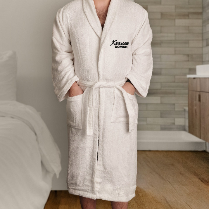 Uniwersalny szlafrok w kolorze białym, wykonany ze 100% bawełny frotte. Wygodny, ładny, mięciutki - zapewni doskonały komfort, gdy wszystkie troski dnia odejdą w dal i nadejdzie czas na relaks. Ogrzeje również zaspane ciałko zaraz po przebudzeniu. Szlafrok ozdobiony jest personalizowanym haftem, który pięknie wygląda, poprawia samopoczucie i zamienia produkt w wyjątkowy upominek!Szlafrok ma elegancki fason z kołnierzykiem i kieszeniami, aby można było zabłysnąć na wieczornym pokazie mody podomowej. Rozmiar szlafroka uniwersalny, gramatura 350 g/m2. Unisex.