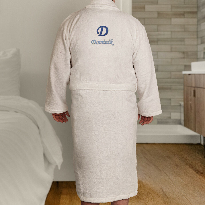 Uniwersalny szlafrok w kolorze białym, wykonany ze 100% bawełny frotte. Wygodny, ładny, mięciutki - zapewni doskonały komfort, gdy wszystkie troski dnia odejdą w dal i nadejdzie czas na relaks. Ogrzeje również zaspane ciałko zaraz po przebudzeniu. Szlafrok ozdobiony jest personalizowanym haftem, który pięknie wygląda, poprawia samopoczucie i zamienia produkt w wyjątkowy upominek!Szlafrok ma elegancki fason z kołnierzykiem i kieszeniami, aby można było zabłysnąć na wieczornym pokazie mody podomowej. Rozmiar szlafroka uniwersalny, gramatura 350 g/m2. Unisex.