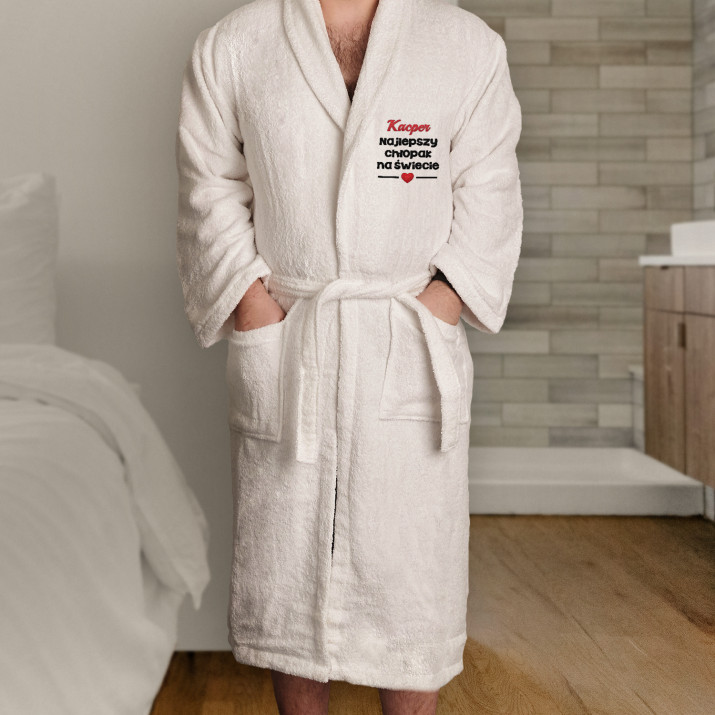 Uniwersalny szlafrok w kolorze białym, wykonany ze 100% bawełny frotte. Wygodny, ładny, mięciutki - zapewni doskonały komfort, gdy wszystkie troski dnia odejdą w dal i nadejdzie czas na relaks. Ogrzeje również zaspane ciałko zaraz po przebudzeniu. Szlafrok ozdobiony jest personalizowanym haftem, który pięknie wygląda, poprawia samopoczucie i zamienia produkt w wyjątkowy upominek!Szlafrok ma elegancki fason z kołnierzykiem i kieszeniami, aby można było zabłysnąć na wieczornym pokazie mody podomowej. Rozmiar szlafroka uniwersalny, gramatura 350 g/m2. Unisex.