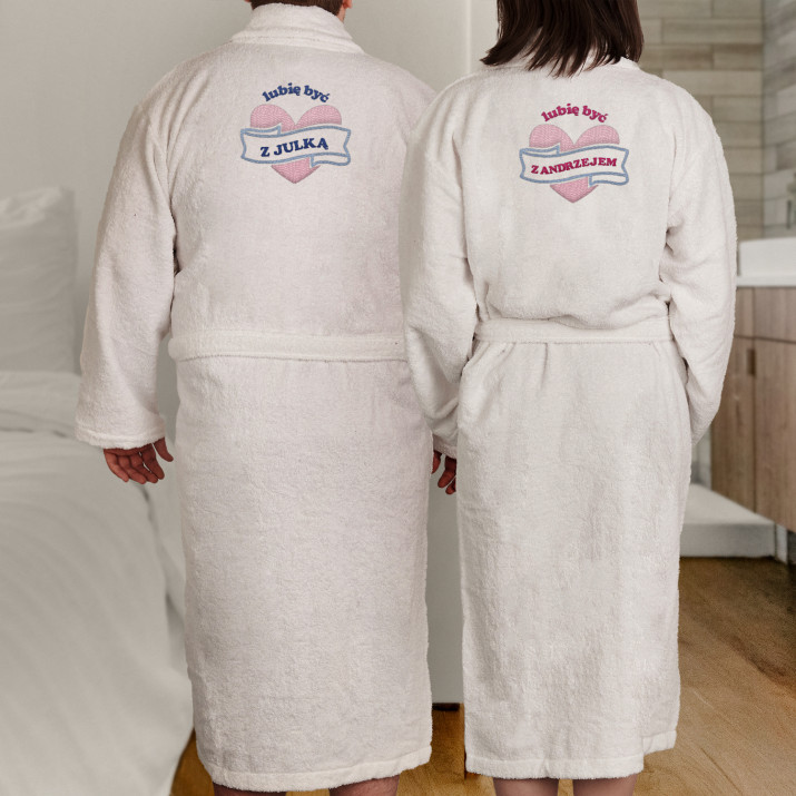 Dwa uniwersalne szlafroki w kolorze białym, wykonane ze 100% bawełny frotte. Wygodne, ładne, mięciutkie - zapewnią doskonały komfort, gdy wszystkie troski dnia odejdą w dal i nadejdzie czas na relaks. Ogrzeją również zaspane ciałka zaraz po przebudzeniu. Szlafroki ozdobione są personalizowanymi haftami, które pięknie wyglądają, poprawiają samopoczucie i zamieniają produkt w wyjątkowy upominek!