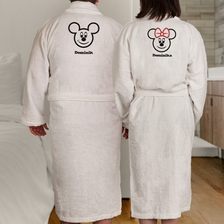 Dwa uniwersalne szlafroki w kolorze białym, wykonane ze 100% bawełny frotte. Wygodne, ładne, mięciutkie - zapewnią doskonały komfort, gdy wszystkie troski dnia odejdą w dal i nadejdzie czas na relaks. Ogrzeją również zaspane ciałka zaraz po przebudzeniu. Szlafroki ozdobione są personalizowanymi haftami, które pięknie wyglądają, poprawiają samopoczucie i zamieniają produkt w wyjątkowy upominek!Każdy szlafrok ma elegancki fason z kołnierzykiem i kieszeniami, aby można było zabłysnąć na wieczornym pokazie mody podomowej. Rozmiar szlafroka uniwersalny, gramatura 350 g/m2. Unisex.