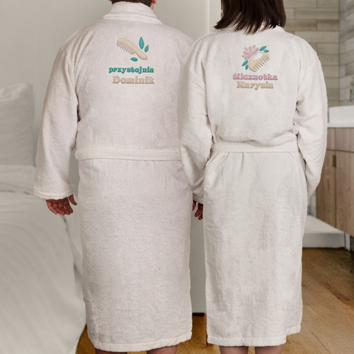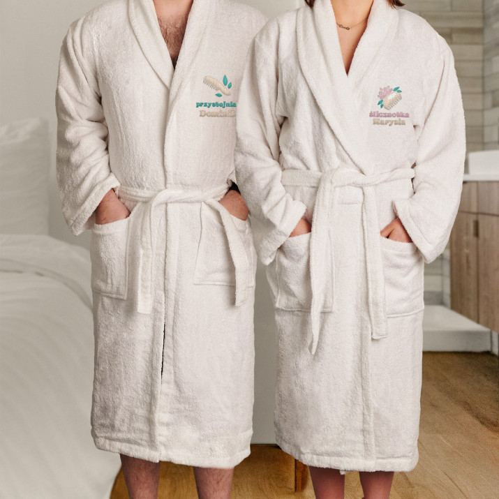 Dwa uniwersalne szlafroki w kolorze białym, wykonane ze 100% bawełny frotte. Wygodne, ładne, mięciutkie - zapewnią doskonały komfort, gdy wszystkie troski dnia odejdą w dal i nadejdzie czas na relaks. Ogrzeją również zaspane ciałka zaraz po przebudzeniu. Szlafroki ozdobione są personalizowanymi haftami, które pięknie wyglądają, poprawiają samopoczucie i zamieniają produkt w wyjątkowy upominek!Każdy szlafrok ma elegancki fason z kołnierzykiem i kieszeniami, aby można było zabłysnąć na wieczornym pokazie mody podomowej. Rozmiar szlafroka uniwersalny, gramatura 350 g/m2. Unisex.
