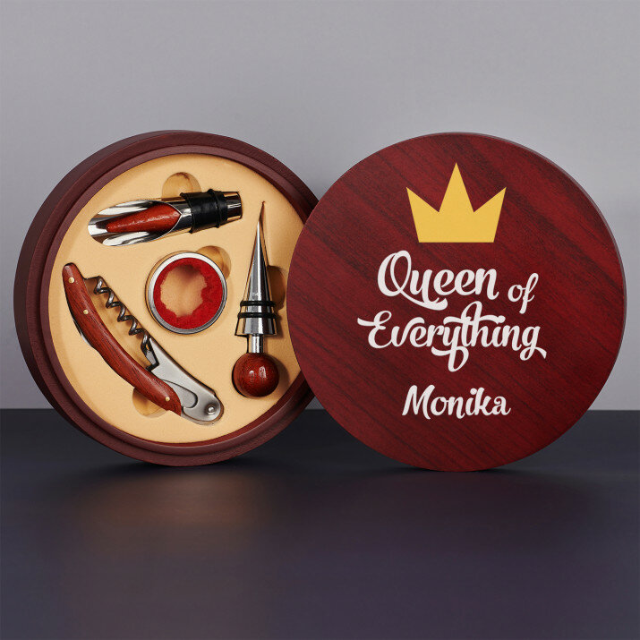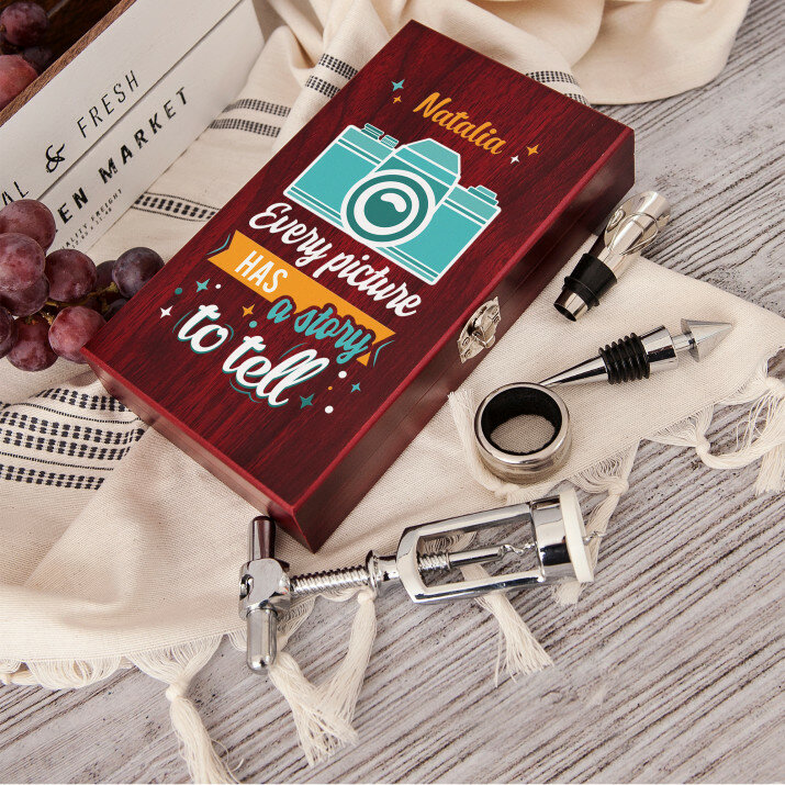 Piękny, czteroczęściowy zestaw do wina w eleganckim drewnianym pudełku z grawerem na pokrywce.Do wyboru są dwie wersje: