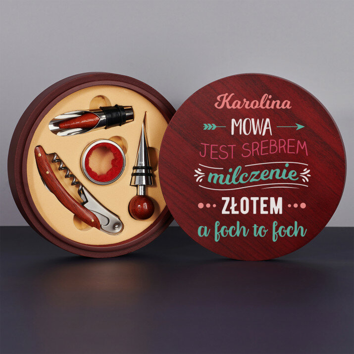 Nic na ziemi nie jest tak antyfochowe jak wino. Jeżeli Twoja kobieta uwielbia od czasu do czasu strzelić niezłego focha, podaruj jej spersonalizowany zestaw do wina. To praktyczny, zabawny, a zarazem elegancki prezent, który podziała jak antybiotyk na każdego, nawet największego focha.Wykonanie