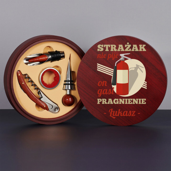 Zestaw okrągły, który zawiera nóż kelnerski, dwie zatyczki ozdobione korkiem oraz opaskę na butelkę. Wymiary tego zestawu to 162 x 40 mm.