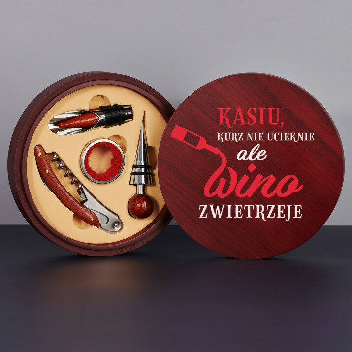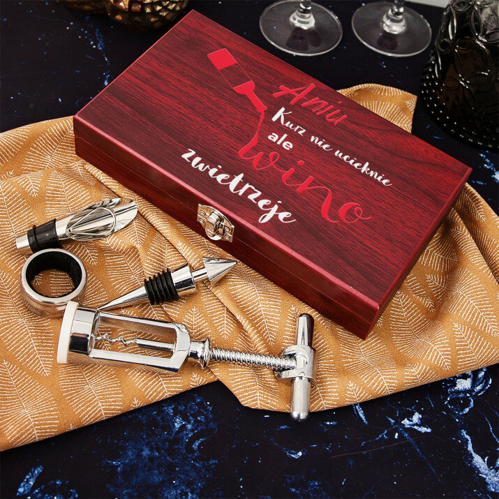 Piękny, czteroczęściowy zestaw do wina w eleganckim drewnianym pudełku z grawerem na pokrywce.Do wyboru są dwie wersje: