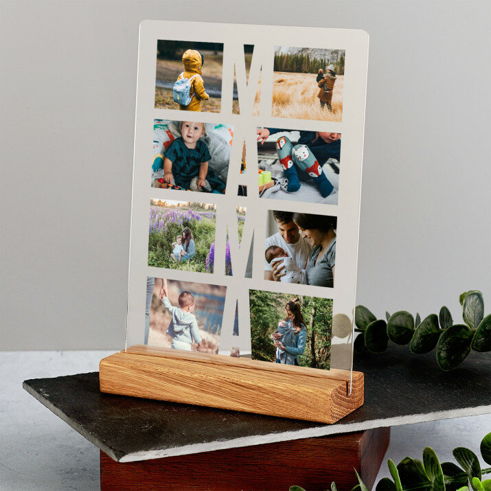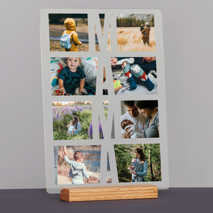 Wydruk na szkle akrylowym z podstawką drewnianą.