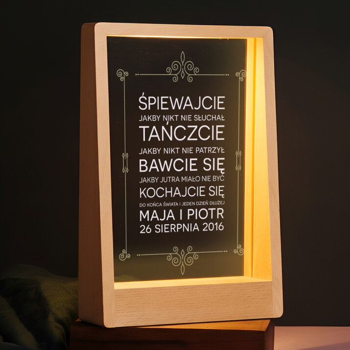 Wyjątkowa pamiątka, która zachwyci obdarowaną osobę! Wydruk na bezbarwnym szkle akrylowym (pleksiglas) o grubości 2 mm to upominek na lata. Materiał wyróżnia się doskonałą jakością powierzchni i sztywnością, jest odporny na uszkodzenia oraz warunki atmosferyczne. Dzięki eleganckiej, drewnianej podstawce wydruk można od razu postawić na półce. Gwarantujemy, że będzie to świetna niespodzianka dla Twoich bliskich!Oferujemy cztery różne opcje dla tego wydruku: