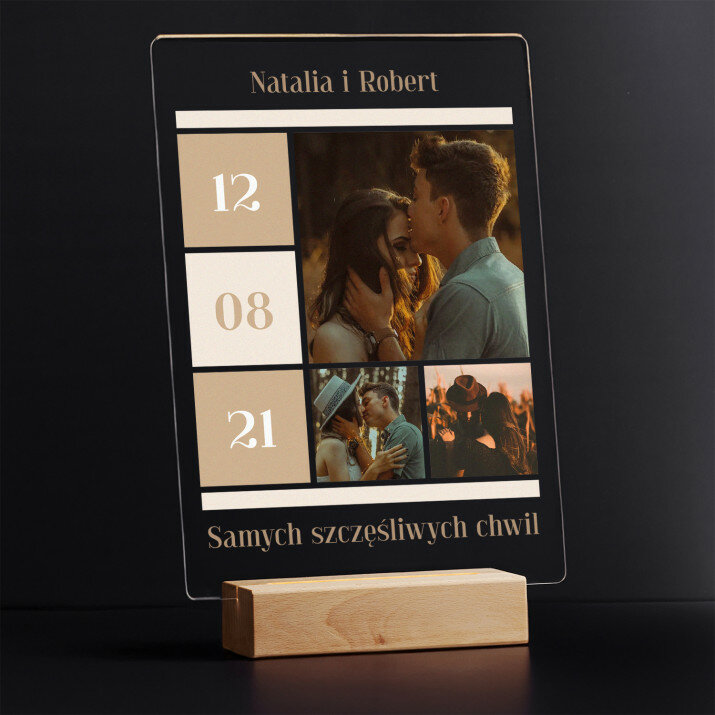 Wyjątkowa pamiątka, która zachwyci obdarowaną osobę! Wydruk na bezbarwnym szkle akrylowym (pleksiglas) o grubości 2 mm to upominek na lata. Materiał wyróżnia się doskonałą jakością powierzchni i sztywnością, jest odporny na uszkodzenia oraz warunki atmosferyczne.Podstawka LED wykonana jest z drewna bukowego. Temperatura barwowa 3000K zapewnia ciepłe, nastrojowe światło, dzięki któremu personalizowana pamiątka będzie wyglądać niczym najpiękniejszy skarb. Gwarantujemy, że będzie to świetna niespodzianka dla Twoich bliskich!