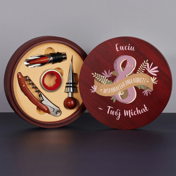 Piękny, czteroczęściowy zestaw do wina w eleganckim drewnianym pudełku z grawerem na pokrywce.Do wyboru są dwie wersje: