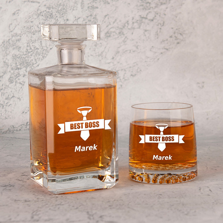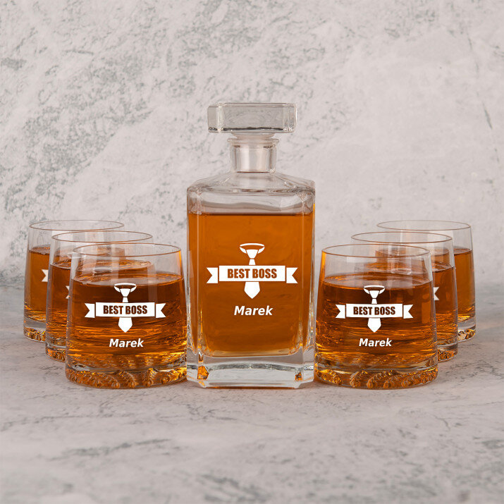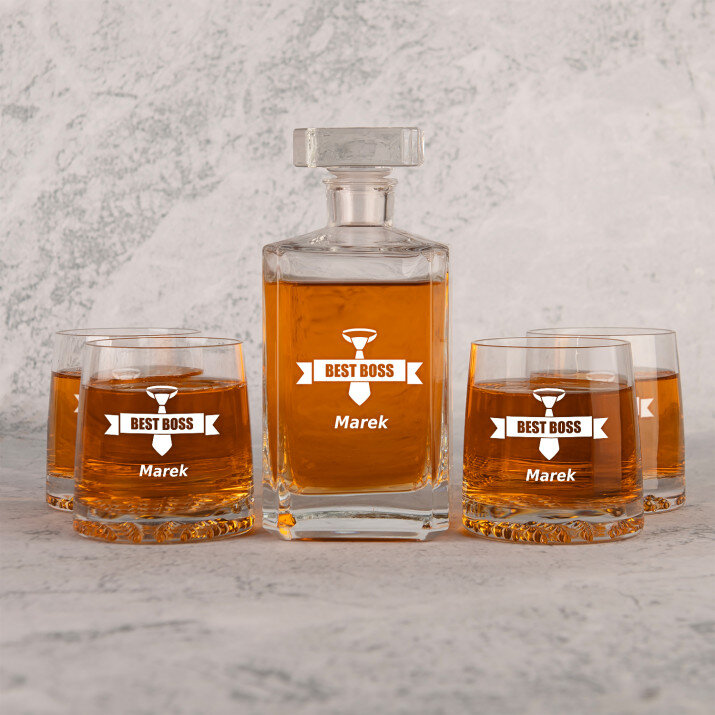 Wysokiej jakości zestaw szklanek to whisky z karafką z przezroczystego szkła to prezent, który pasuje na wiele ważnych okazji. W takiej karafce można zaserwować whisky, nalewkę lub inny ulubiony trunek. Prosta forma i elegancki styl sprawiają, że produkt będzie pasował zarówno do weekendowych spotkań z najbliższymi, jak i do uroczystych przyjęć. Kwadratowy kształt karafki załamuje światło, które pięknie wydobywa barwę trunku. Na powierzchni karafki umieszczamy personalizowany grawer, który dodaje upominkowi wyjątkowego charakteru. Stylowe szklanki do whisky są wykonane z bezbarwnego szkła z charakterystycznymi wgłębieniami w dnie, które przypominają kryształki lodu. Minimalistyczny i elegancki design sprawia, że ulubiony trunek pięknie się prezentuje, a gładkie ścianki wspaniale eksponują grawer.